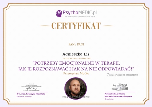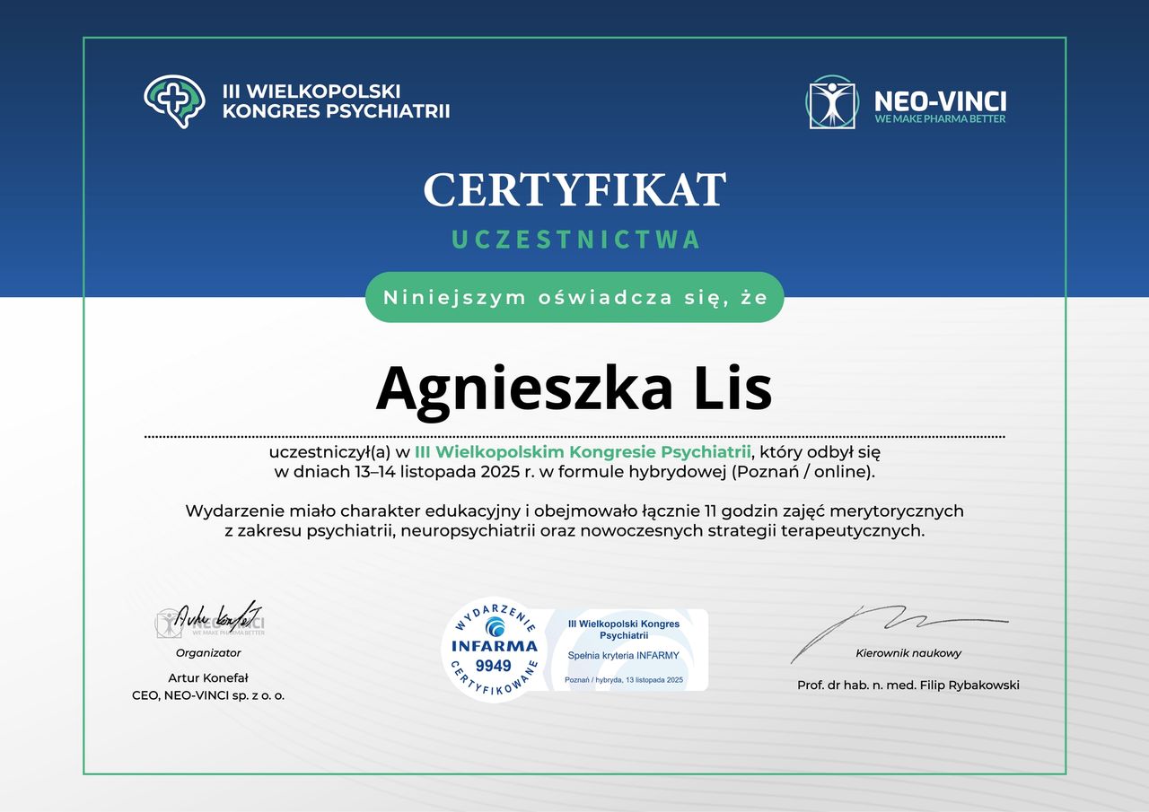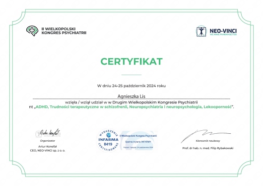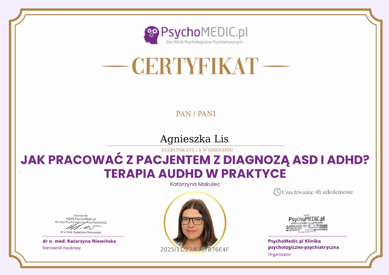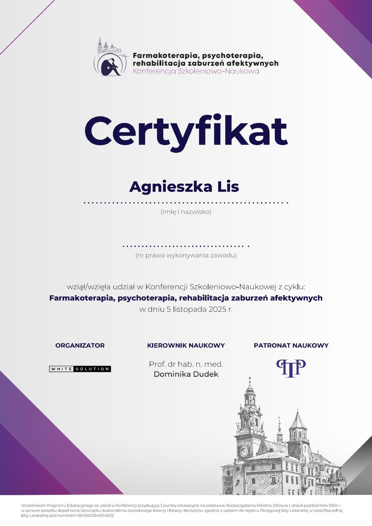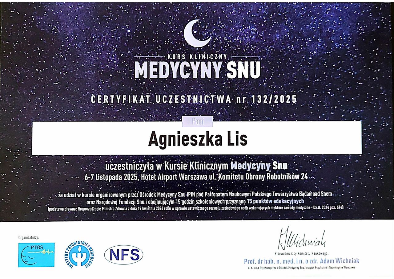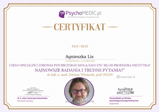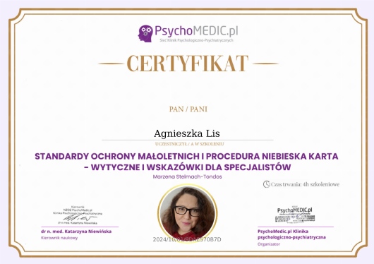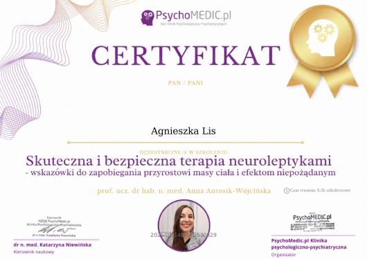 Ukończyłam I Wydział Lekarski Uniwersytetu Medycznego w Lublinie z wynikiem bardzo dobrym. Szkolenie w zakresie psychiatrii odbywałam w II Klinice Psychiatrii i Rehabilitacji Psychiatrycznej SPSK 1 w Lublinie, gdzie prowadziłam również zajęcia ze studentami kierunku lekarskiego oraz brałam udział w badaniach klinicznych. W 2022 rozpoczęłam szkolenie w psychoterapii w Całościowym Kursie Psychoterapii Katedry Psychoterapii UJ Collegium Medicum w Krakowie we współpracy z Fundacją dla Celów Rozwoju Podejścia Psychobiospołecznego w Medycynie "PSYCHOMED". Doświadczenie zawodowe dodatkowo zdobywałam, pracując w Szpitalu Neuropsychiatrycznym w Lublinie, w Oddziałach Dziennych Lubelskiego Stowarzyszenia Ochrony Zdrowia Psychicznego, w Centrum Zdrowia Psychicznego dla osób z podwójną diagnozą psychiatryczną w Lublinie, a także w Poradniach Zdrowia Psychicznego na terenie Lublina oraz Zamościa. Od początku swojej kariery stawiam na bliski, empatyczny kontakt z pacjentem. Szczególną uwagę poświęcam holistycznemu podejściu do problemów zdrowotnych pacjenta. Stale dążę do podnoszenia kwalifikacji oraz kompetencji zawodowych. Moje zainteresowania kliniczne obejmują choroby afektywne, psychozy, zaburzenia nerwicowe, zaburzenia odżywiania, uzależnienia, zaburzenia osobowości i zachowania, zaburzenia snu. Poza leczeniem farmakologicznym przykładam dużą wagę do psychoterapii, gdyż uważam, że takie połączenie jest w praktyce najskuteczniejsze w uzyskaniu pełnej remisji objawowej oraz w zapobieganiu nawrotom zaburzeń. Cenię współpracę z psychoterapeutami. Swoją pracę poddaję regularnie superwizji. Jestem członkiem Polskiego Towarzystwa Psychiatrycznego Od lutego 2020 jestem także certyfikowanym trenerem personalnym ATS Akademii Trenerów Sportu Współtworzyłam również podcast edukacyjny "Na Zdrowie" - odcinki o tematyce zdrowia psychicznego.