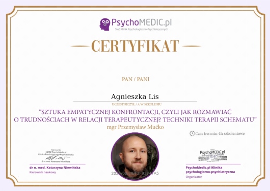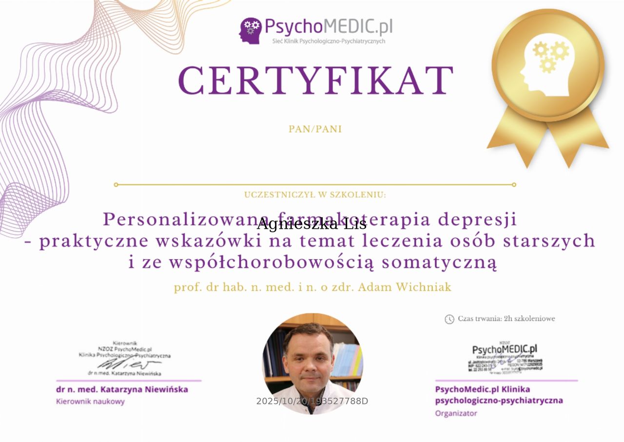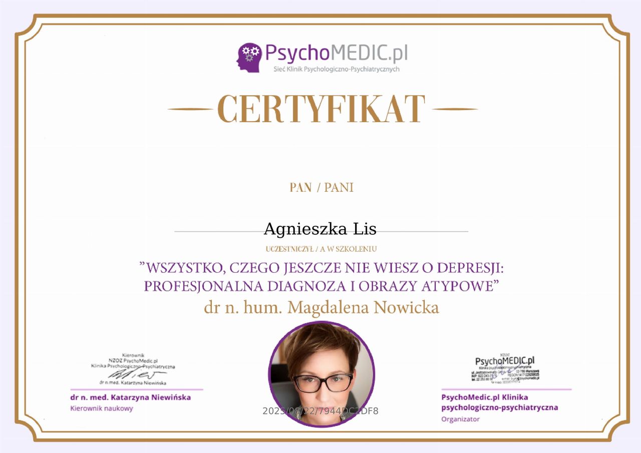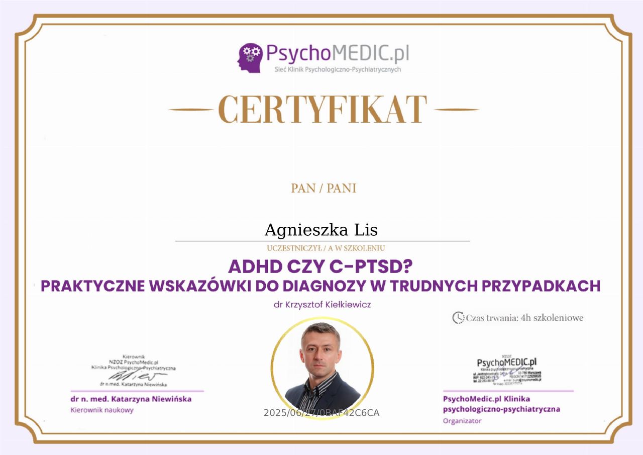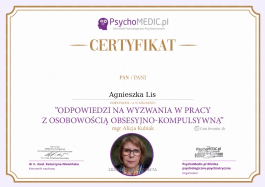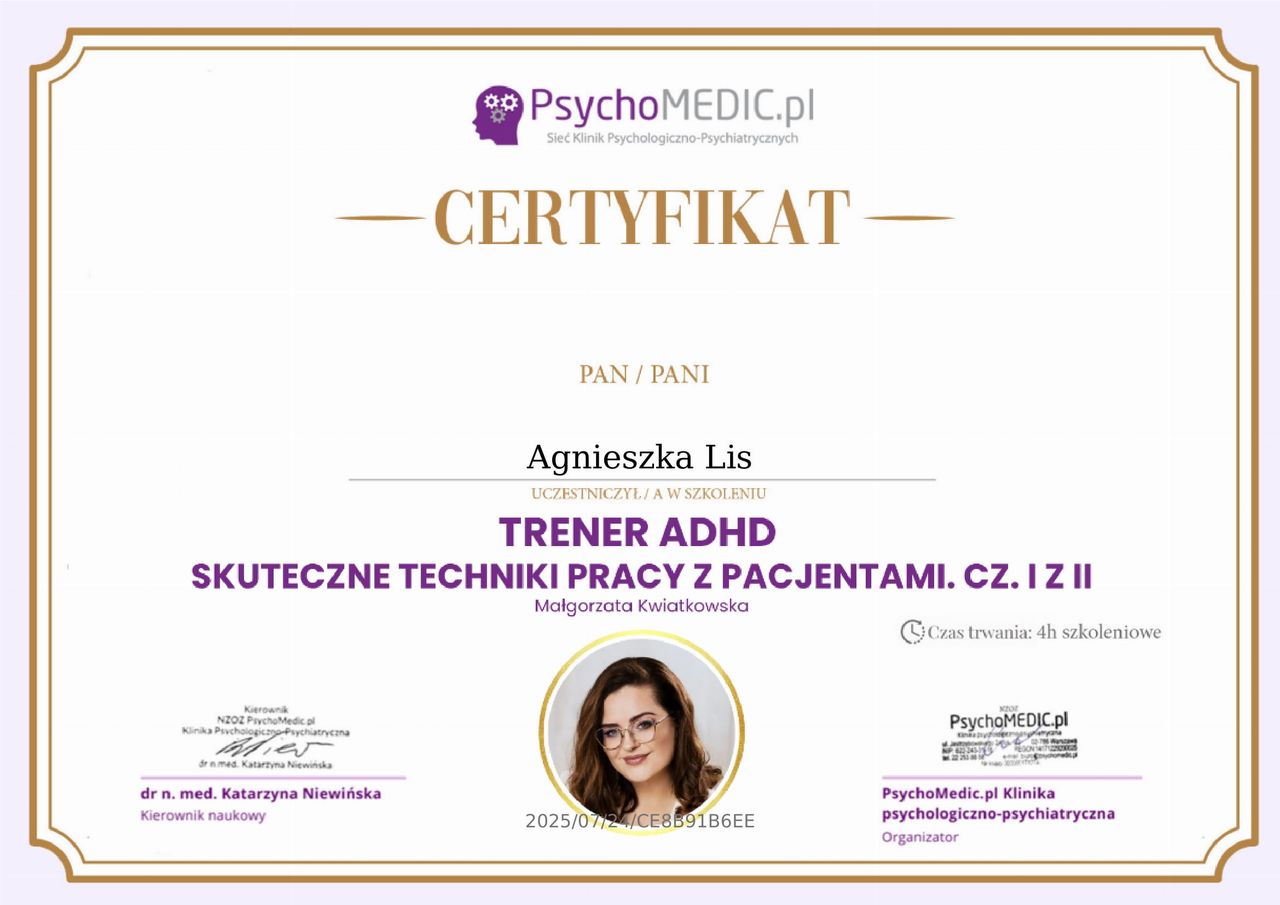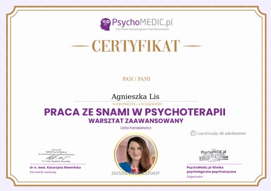 Ukończyłam I Wydział Lekarski Uniwersytetu Medycznego w Lublinie z wynikiem bardzo dobrym. Szkolenie w zakresie psychiatrii odbywałam w II Klinice Psychiatrii i Rehabilitacji Psychiatrycznej SPSK 1 w Lublinie, gdzie prowadziłam również zajęcia ze studentami kierunku lekarskiego oraz brałam udział w badaniach klinicznych. W 2022 rozpoczęłam szkolenie w psychoterapii w Całościowym Kursie Psychoterapii Katedry Psychoterapii UJ Collegium Medicum w Krakowie we współpracy z Fundacją dla Celów Rozwoju Podejścia Psychobiospołecznego w Medycynie "PSYCHOMED". Doświadczenie zawodowe dodatkowo zdobywałam, pracując w Szpitalu Neuropsychiatrycznym w Lublinie, w Oddziałach Dziennych Lubelskiego Stowarzyszenia Ochrony Zdrowia Psychicznego, w Centrum Zdrowia Psychicznego dla osób z podwójną diagnozą psychiatryczną w Lublinie, a także w Poradniach Zdrowia Psychicznego na terenie Lublina oraz Zamościa. Od początku swojej kariery stawiam na bliski, empatyczny kontakt z pacjentem. Szczególną uwagę poświęcam holistycznemu podejściu do problemów zdrowotnych pacjenta. Stale dążę do podnoszenia kwalifikacji oraz kompetencji zawodowych. Moje zainteresowania kliniczne obejmują choroby afektywne, psychozy, zaburzenia nerwicowe, zaburzenia odżywiania, uzależnienia, zaburzenia osobowości i zachowania, zaburzenia snu. Poza leczeniem farmakologicznym przykładam dużą wagę do psychoterapii, gdyż uważam, że takie połączenie jest w praktyce najskuteczniejsze w uzyskaniu pełnej remisji objawowej oraz w zapobieganiu nawrotom zaburzeń. Cenię współpracę z psychoterapeutami. Swoją pracę poddaję regularnie superwizji. Jestem członkiem Polskiego Towarzystwa Psychiatrycznego Od lutego 2020 jestem także certyfikowanym trenerem personalnym ATS Akademii Trenerów Sportu Współtworzyłam również podcast edukacyjny "Na Zdrowie" - odcinki o tematyce zdrowia psychicznego.