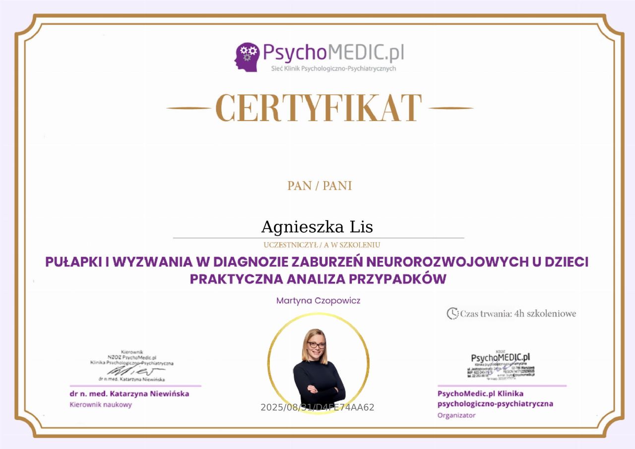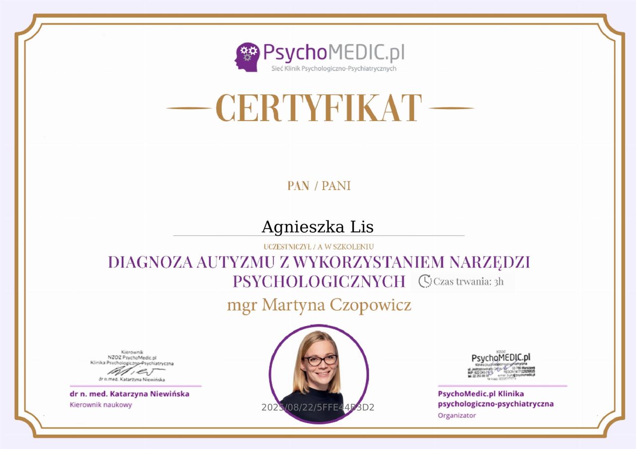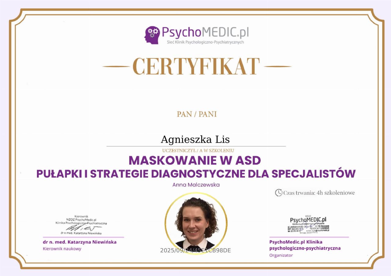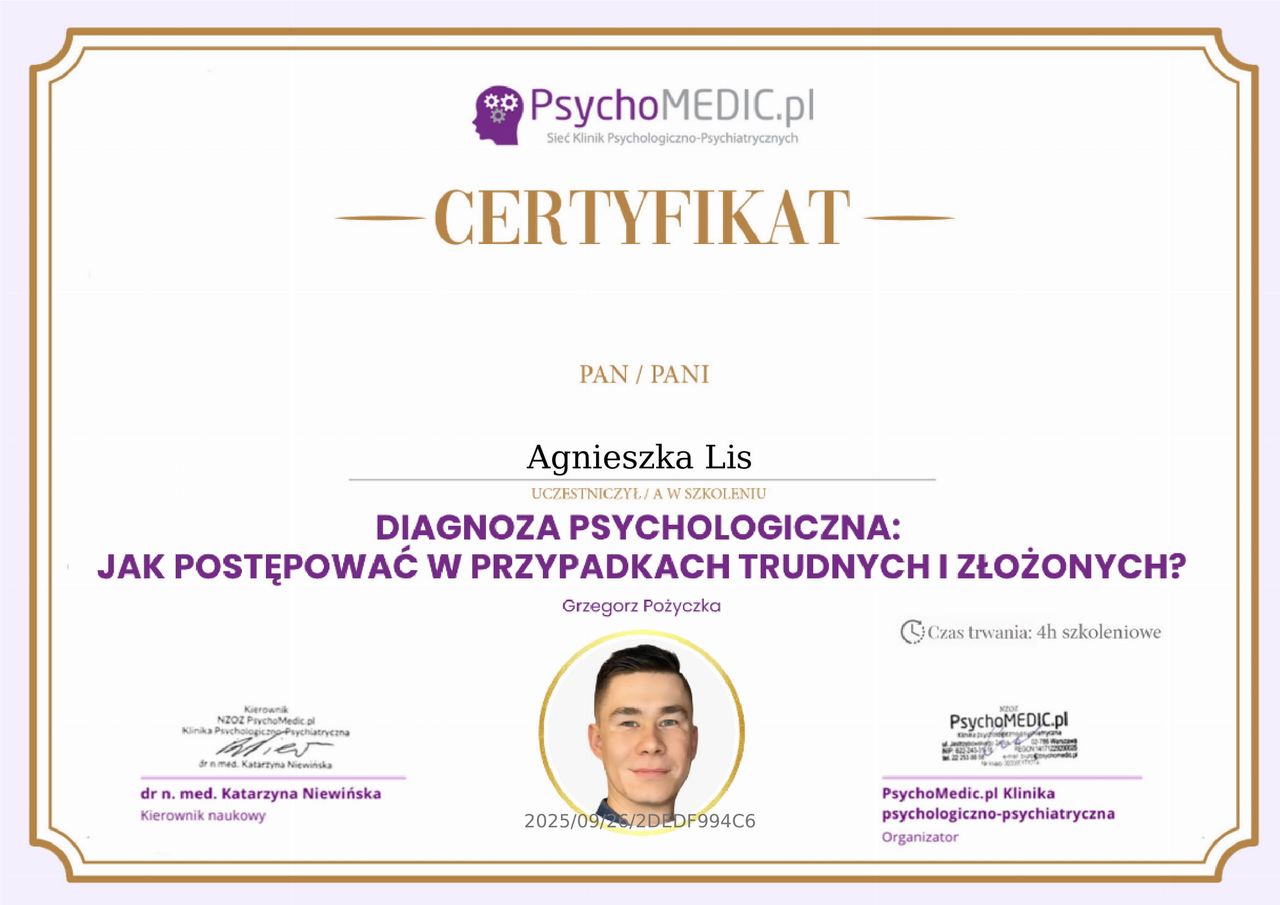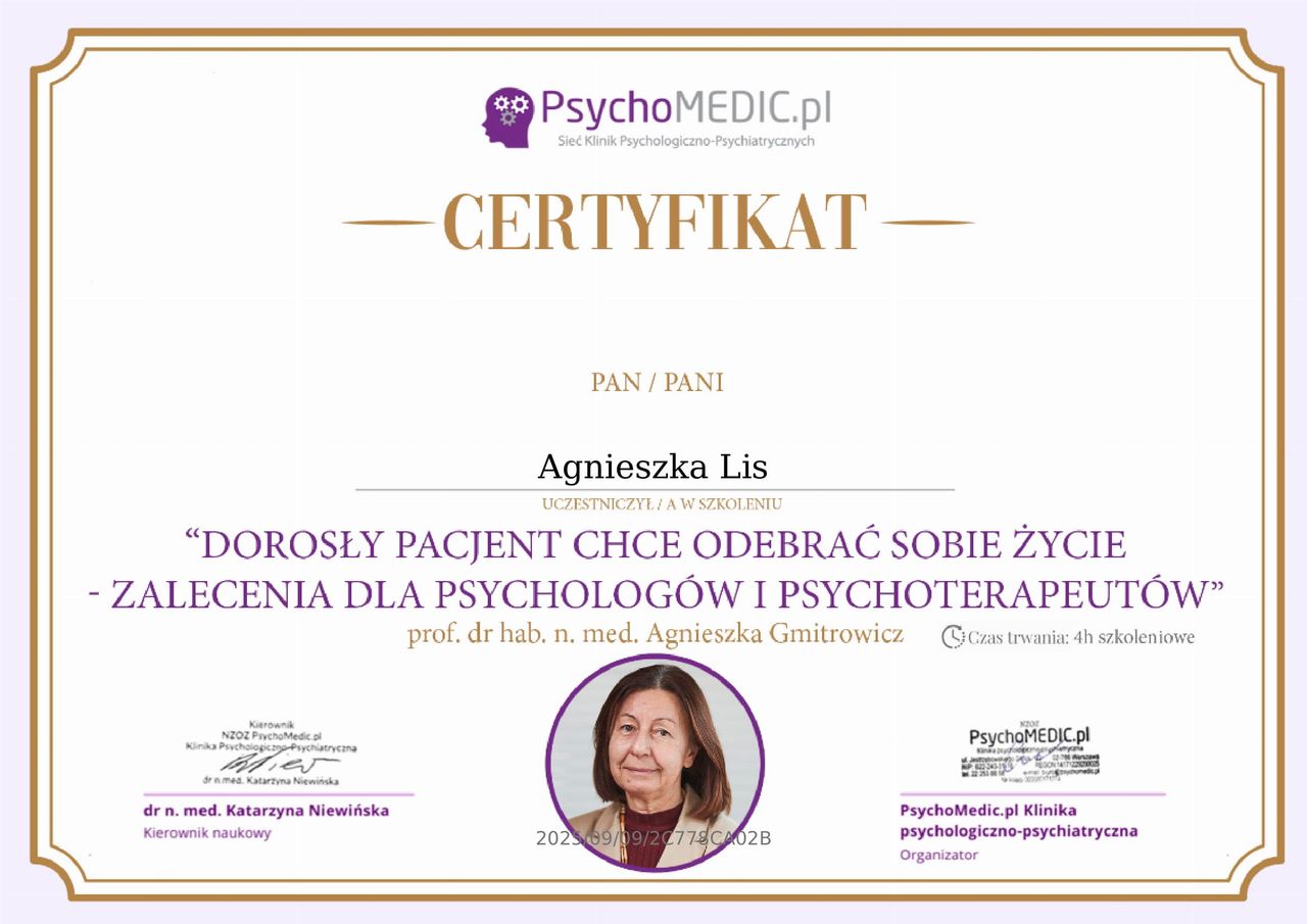 Ukończyłam I Wydział Lekarski Uniwersytetu Medycznego w Lublinie z wynikiem bardzo dobrym. Szkolenie w zakresie psychiatrii odbywałam w II Klinice Psychiatrii i Rehabilitacji Psychiatrycznej SPSK 1 w Lublinie, gdzie prowadziłam również zajęcia ze studentami kierunku lekarskiego oraz brałam udział w badaniach klinicznych. W 2022 rozpoczęłam szkolenie w psychoterapii w Całościowym Kursie Psychoterapii Katedry Psychoterapii UJ Collegium Medicum w Krakowie we współpracy z Fundacją dla Celów Rozwoju Podejścia Psychobiospołecznego w Medycynie "PSYCHOMED". Doświadczenie zawodowe dodatkowo zdobywałam, pracując w Szpitalu Neuropsychiatrycznym w Lublinie, w Oddziałach Dziennych Lubelskiego Stowarzyszenia Ochrony Zdrowia Psychicznego, w Centrum Zdrowia Psychicznego dla osób z podwójną diagnozą psychiatryczną w Lublinie, a także w Poradniach Zdrowia Psychicznego na terenie Lublina oraz Zamościa. Od początku swojej kariery stawiam na bliski, empatyczny kontakt z pacjentem. Szczególną uwagę poświęcam holistycznemu podejściu do problemów zdrowotnych pacjenta. Stale dążę do podnoszenia kwalifikacji oraz kompetencji zawodowych. Moje zainteresowania kliniczne obejmują choroby afektywne, psychozy, zaburzenia nerwicowe, zaburzenia odżywiania, uzależnienia, zaburzenia osobowości i zachowania, zaburzenia snu. Poza leczeniem farmakologicznym przykładam dużą wagę do psychoterapii, gdyż uważam, że takie połączenie jest w praktyce najskuteczniejsze w uzyskaniu pełnej remisji objawowej oraz w zapobieganiu nawrotom zaburzeń. Cenię współpracę z psychoterapeutami. Swoją pracę poddaję regularnie superwizji. Jestem członkiem Polskiego Towarzystwa Psychiatrycznego Od lutego 2020 jestem także certyfikowanym trenerem personalnym ATS Akademii Trenerów Sportu Współtworzyłam również podcast edukacyjny "Na Zdrowie" - odcinki o tematyce zdrowia psychicznego.