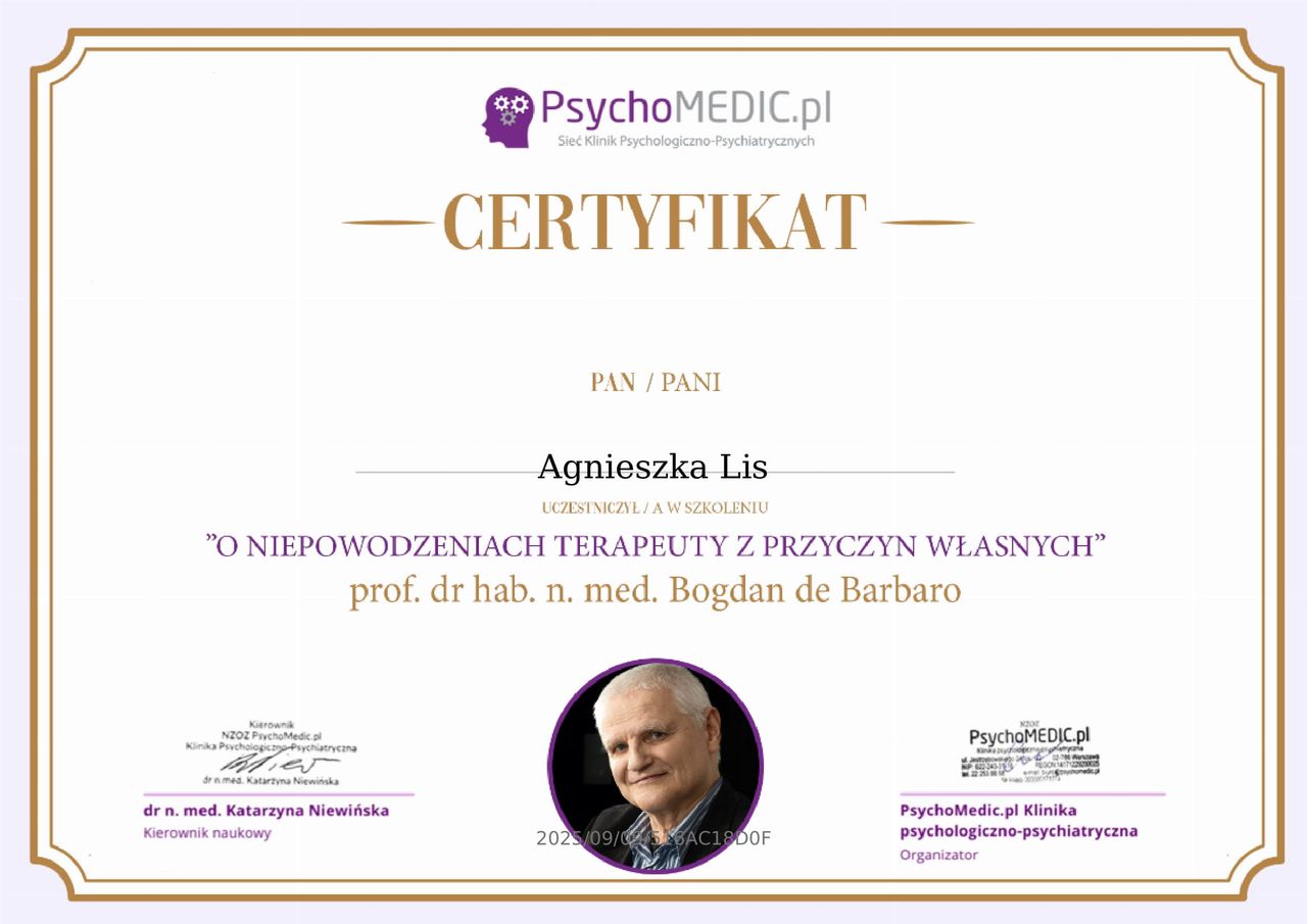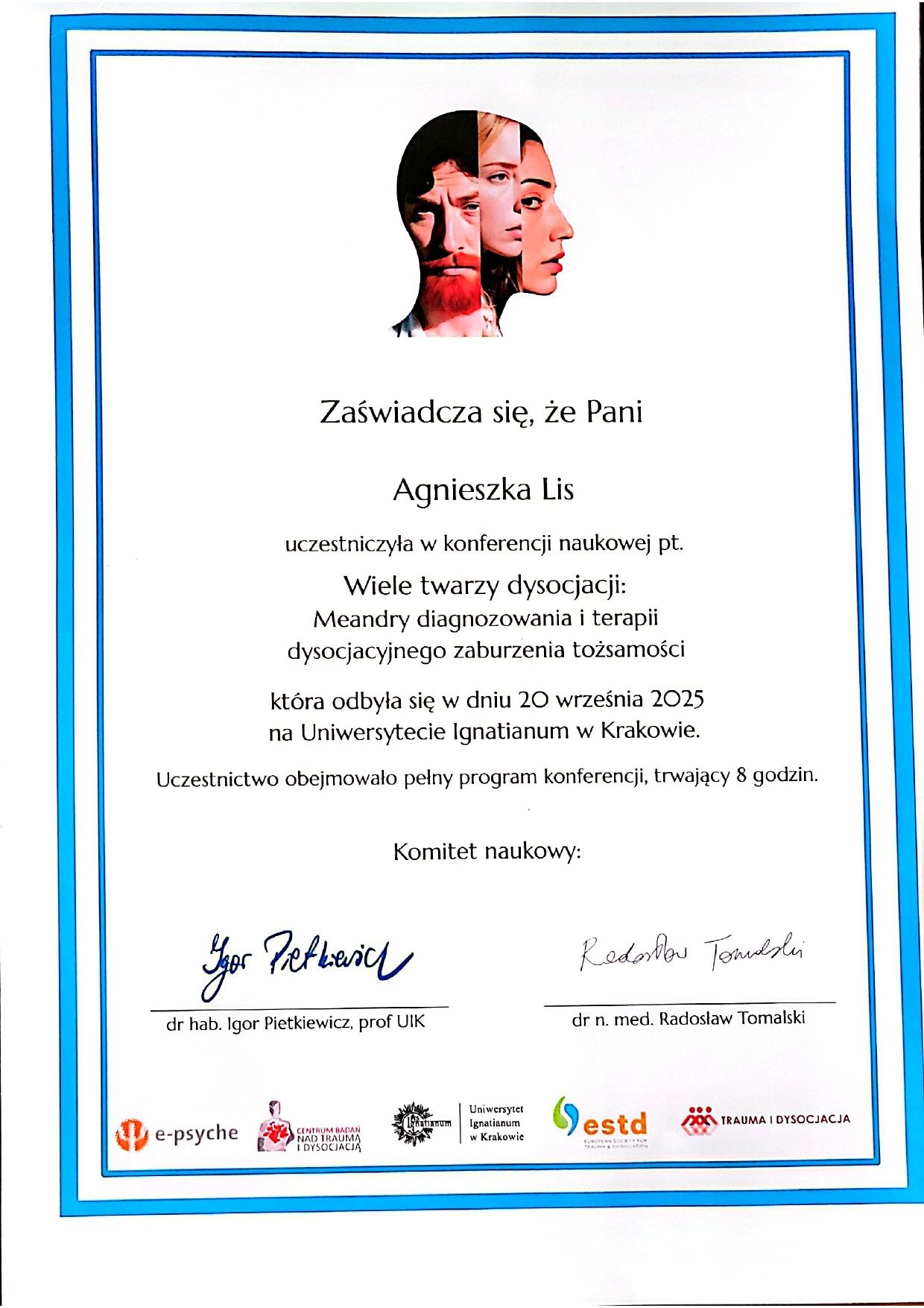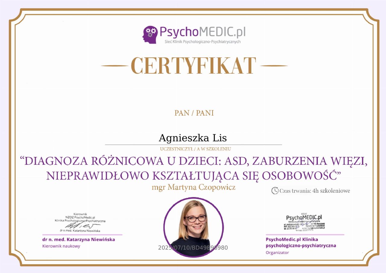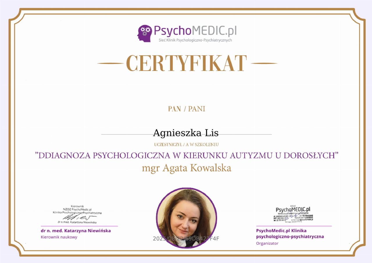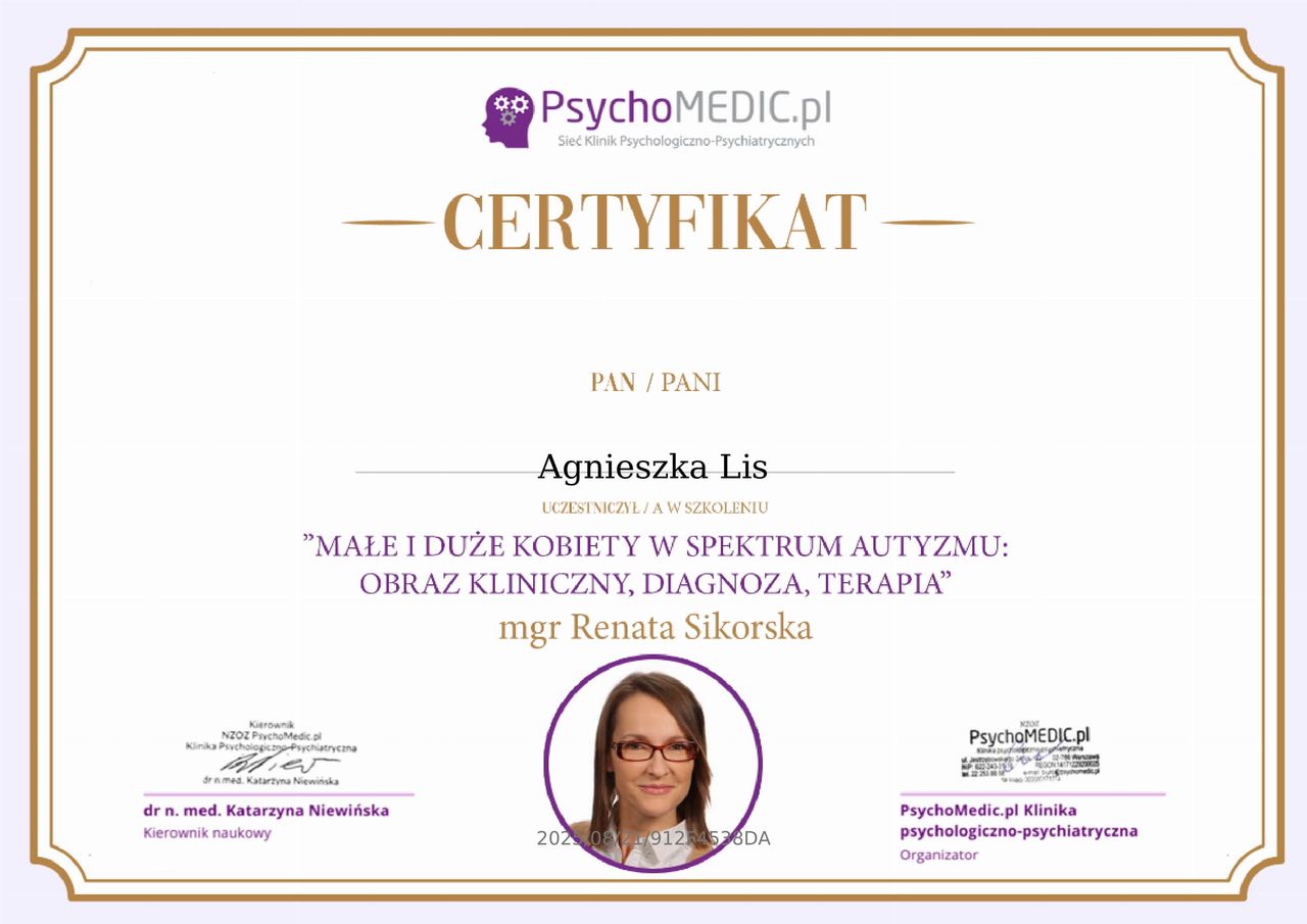 Ukończyłam I Wydział Lekarski Uniwersytetu Medycznego w Lublinie z wynikiem bardzo dobrym. Szkolenie w zakresie psychiatrii odbywałam w II Klinice Psychiatrii i Rehabilitacji Psychiatrycznej SPSK 1 w Lublinie, gdzie prowadziłam również zajęcia ze studentami kierunku lekarskiego oraz brałam udział w badaniach klinicznych. W 2022 rozpoczęłam szkolenie w psychoterapii w Całościowym Kursie Psychoterapii Katedry Psychoterapii UJ Collegium Medicum w Krakowie we współpracy z Fundacją dla Celów Rozwoju Podejścia Psychobiospołecznego w Medycynie "PSYCHOMED". Doświadczenie zawodowe dodatkowo zdobywałam, pracując w Szpitalu Neuropsychiatrycznym w Lublinie, w Oddziałach Dziennych Lubelskiego Stowarzyszenia Ochrony Zdrowia Psychicznego, w Centrum Zdrowia Psychicznego dla osób z podwójną diagnozą psychiatryczną w Lublinie, a także w Poradniach Zdrowia Psychicznego na terenie Lublina oraz Zamościa. Od początku swojej kariery stawiam na bliski, empatyczny kontakt z pacjentem. Szczególną uwagę poświęcam holistycznemu podejściu do problemów zdrowotnych pacjenta. Stale dążę do podnoszenia kwalifikacji oraz kompetencji zawodowych. Moje zainteresowania kliniczne obejmują choroby afektywne, psychozy, zaburzenia nerwicowe, zaburzenia odżywiania, uzależnienia, zaburzenia osobowości i zachowania, zaburzenia snu. Poza leczeniem farmakologicznym przykładam dużą wagę do psychoterapii, gdyż uważam, że takie połączenie jest w praktyce najskuteczniejsze w uzyskaniu pełnej remisji objawowej oraz w zapobieganiu nawrotom zaburzeń. Cenię współpracę z psychoterapeutami. Swoją pracę poddaję regularnie superwizji. Jestem członkiem Polskiego Towarzystwa Psychiatrycznego Od lutego 2020 jestem także certyfikowanym trenerem personalnym ATS Akademii Trenerów Sportu Współtworzyłam również podcast edukacyjny "Na Zdrowie" - odcinki o tematyce zdrowia psychicznego.