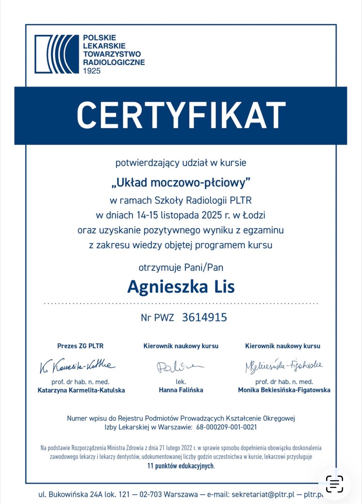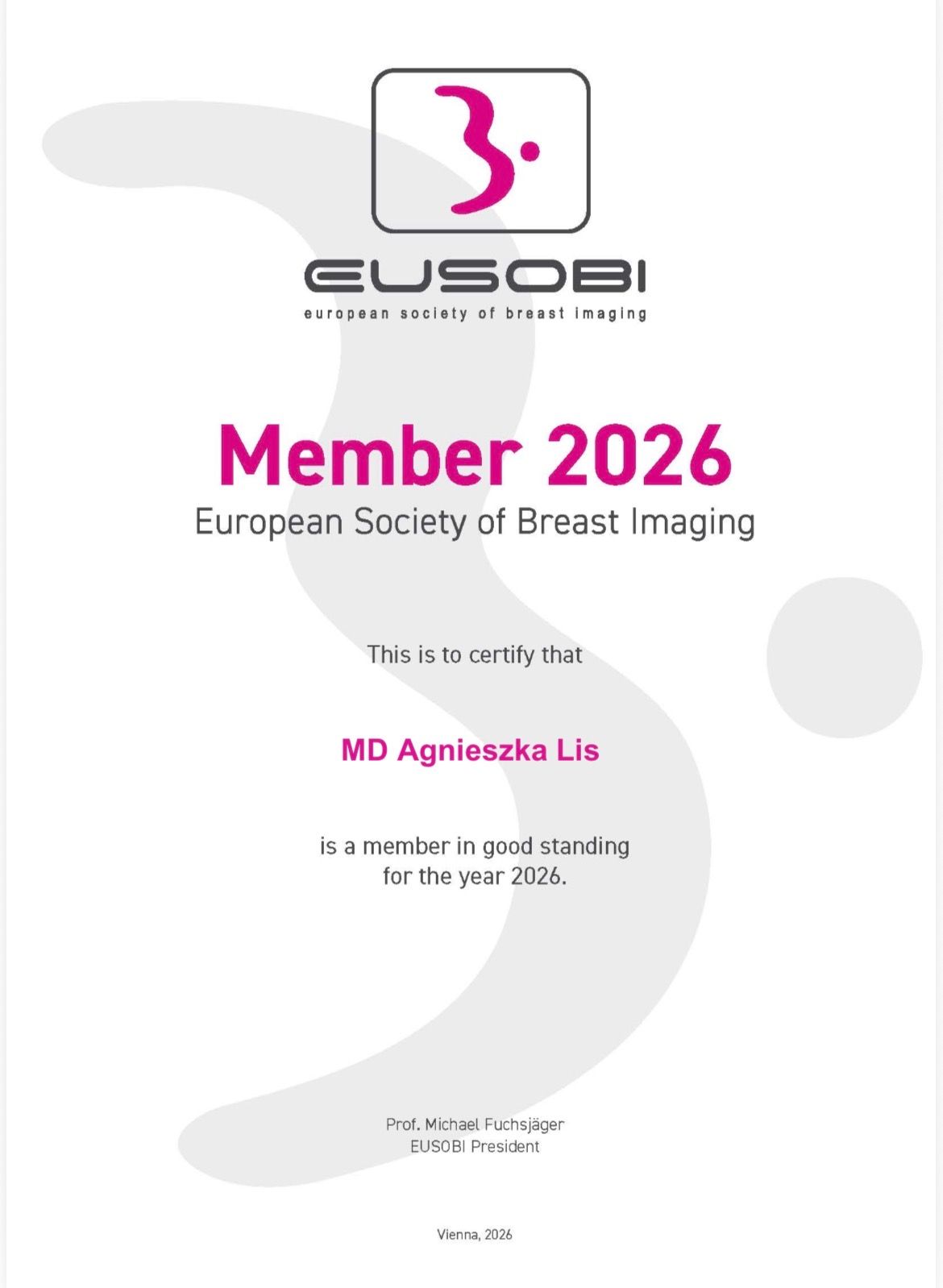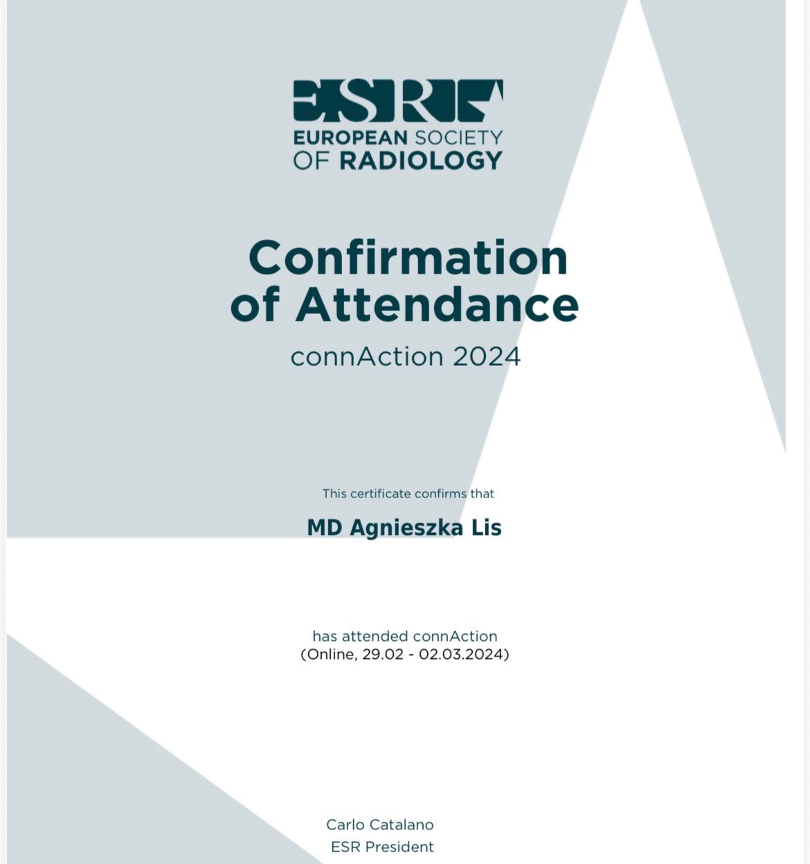Cały czas staram się uaktualniać wiedzę biorąc udział w licznych konferencjach i szkoleniach. Jestem recenzentką topowego europejskiego czasopisma radiologicznego.