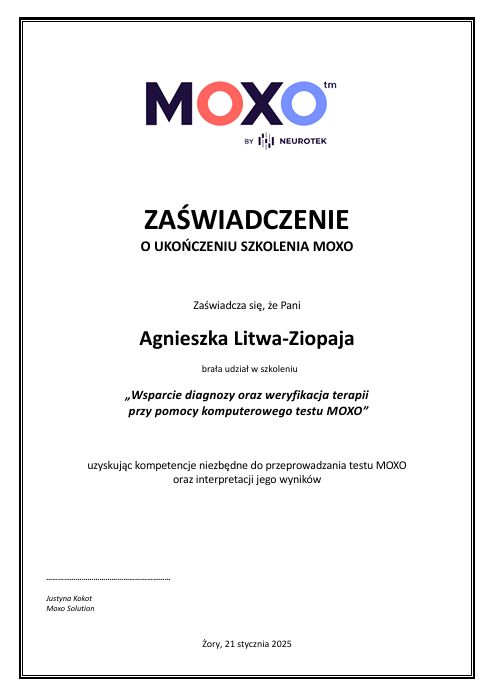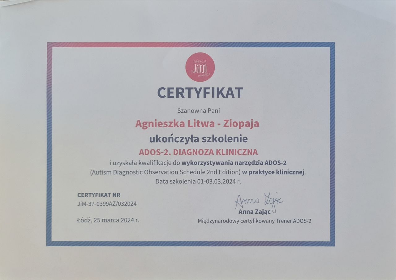 Certyfikowany diagnosta ADOS-2 i ADHD MOXO (świadczy o umiejętnościach diagnostycznych i pracy z szerokim spektrum pacjentów).