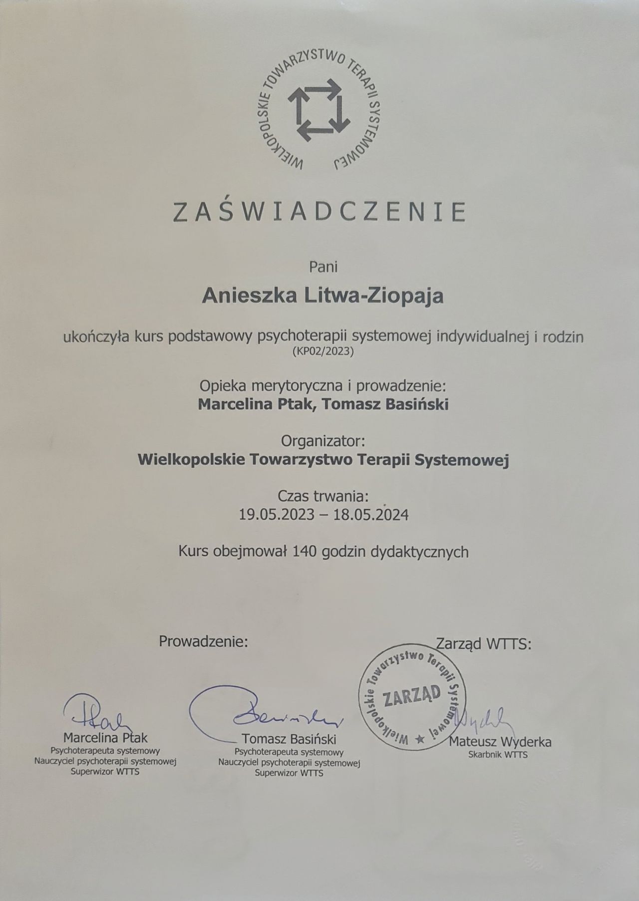 Kurs Podstawowy Terapii Systemowej, Wielkopolskie Towarzystwo Terapii Systemowej, Wrocław (05.2023 – 06.2024)
