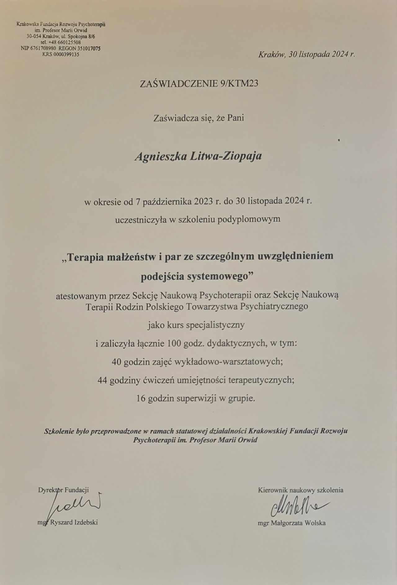 Terapia Małżeństw i Par ze szczególnym uwzględnieniem podejścia systemowego, Krakowska Fundacja Rozwoju Psychoterapii im. Profesor Marii Orwid, Kraków (10.2023 – 12.2024)