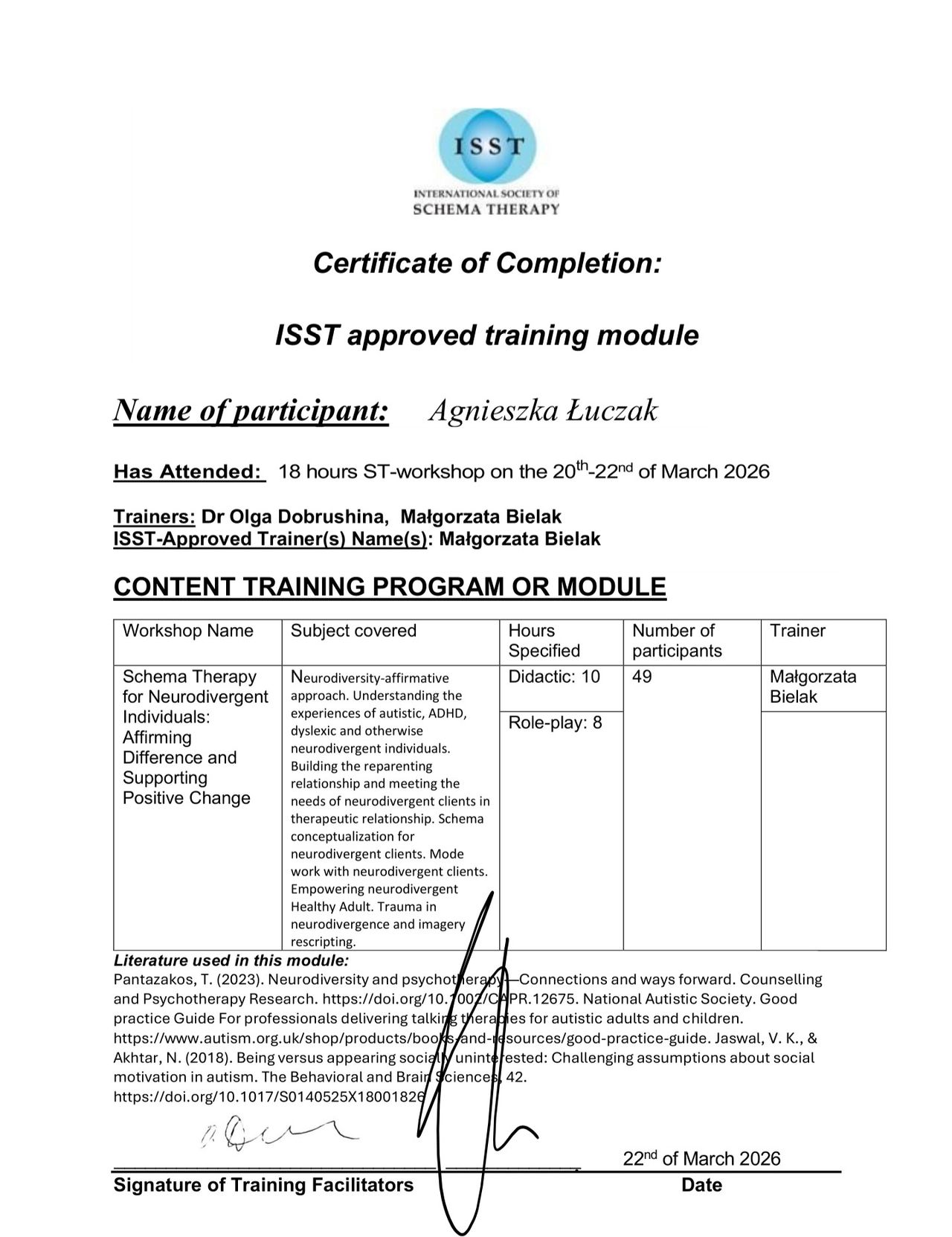 W obszarze moich zainteresowań i rozwoju znajdują się również podejścia terapeutyczne tzw. trzeciej fali terapii: DBT, ACT, EFT. W celu zagwarantowania Państwu najlepszej opieki nieustannie podnoszę swoje kwalifikacje uczestnicząc w kursach i szkoleniach. Moja praca podlega stałej superwizji. Moje kwalifikacje pozwalają mi od ponad 20 lat wykonywać obowiązki biegłego psychologa sądowego.