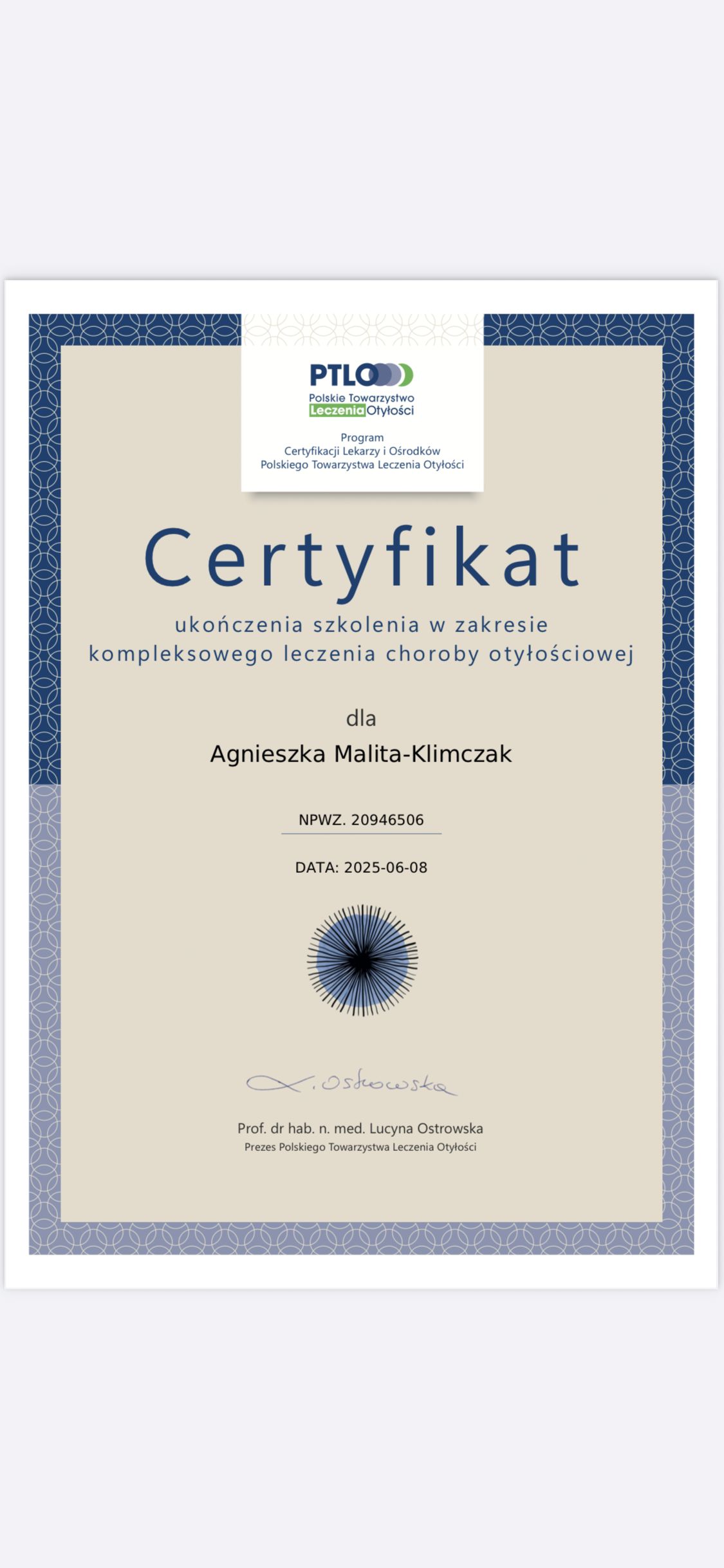Jaki jest zakres porad oferowanych przez Agnieszka Malita-Klimczak?Agnieszka Malita-Klimczak to lekarz rodzinny. Na podstawie swojego doświadczenia i wykształcenia Agnieszka Malita-Klimczak oferuje usługi takie jak: Konsultacja obesitologiczna (leczenie otyłości), Analiza składu ciała, farmakologiczne leczenie otyłości, konsultacja insulinooporność/nadwaga/otyłość, Konsultacja leczenia nadwagi i otyłości, leczenie insulinooporności, leczenie nadwagi i otyłości - konsultacja lekarska, Porada z zakresu otyłości, insulinooporności, leczenie otyłości.