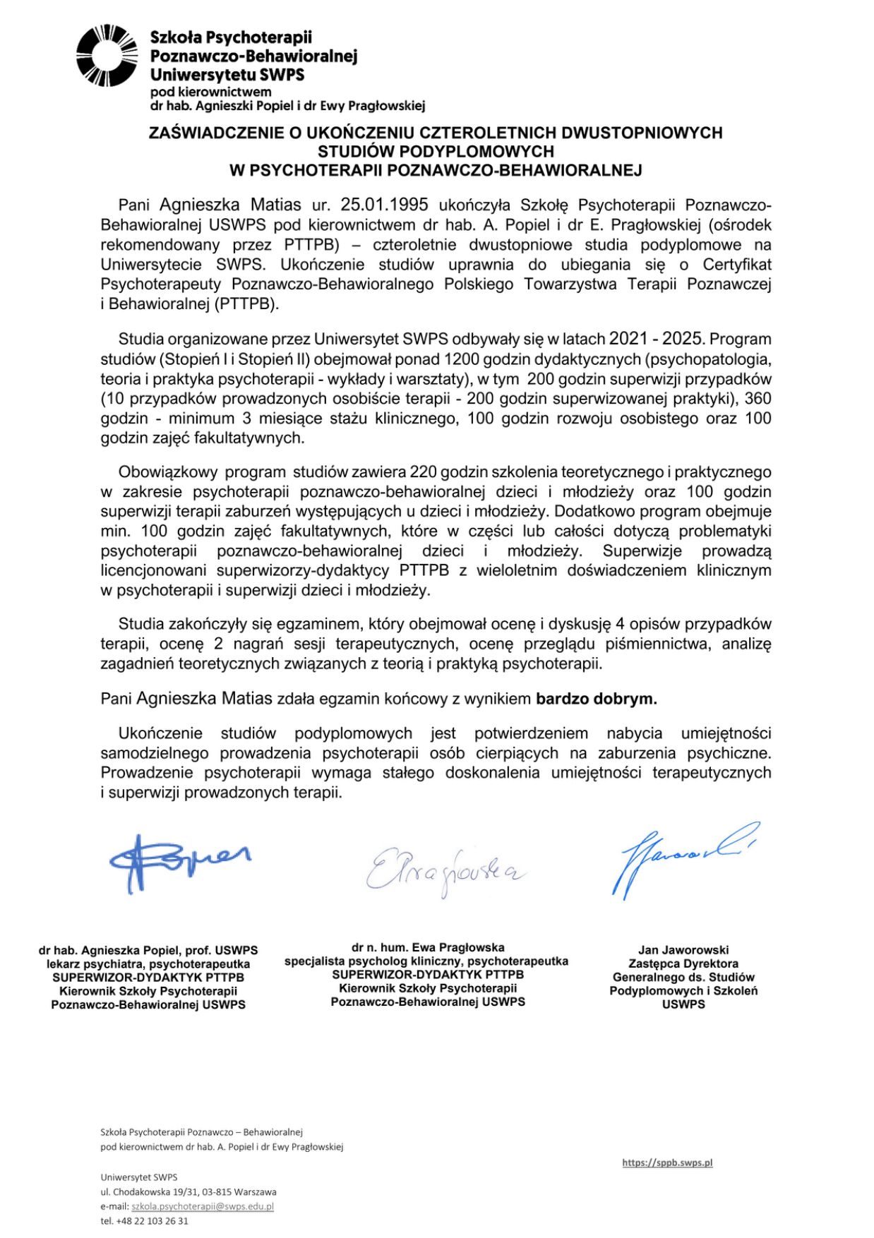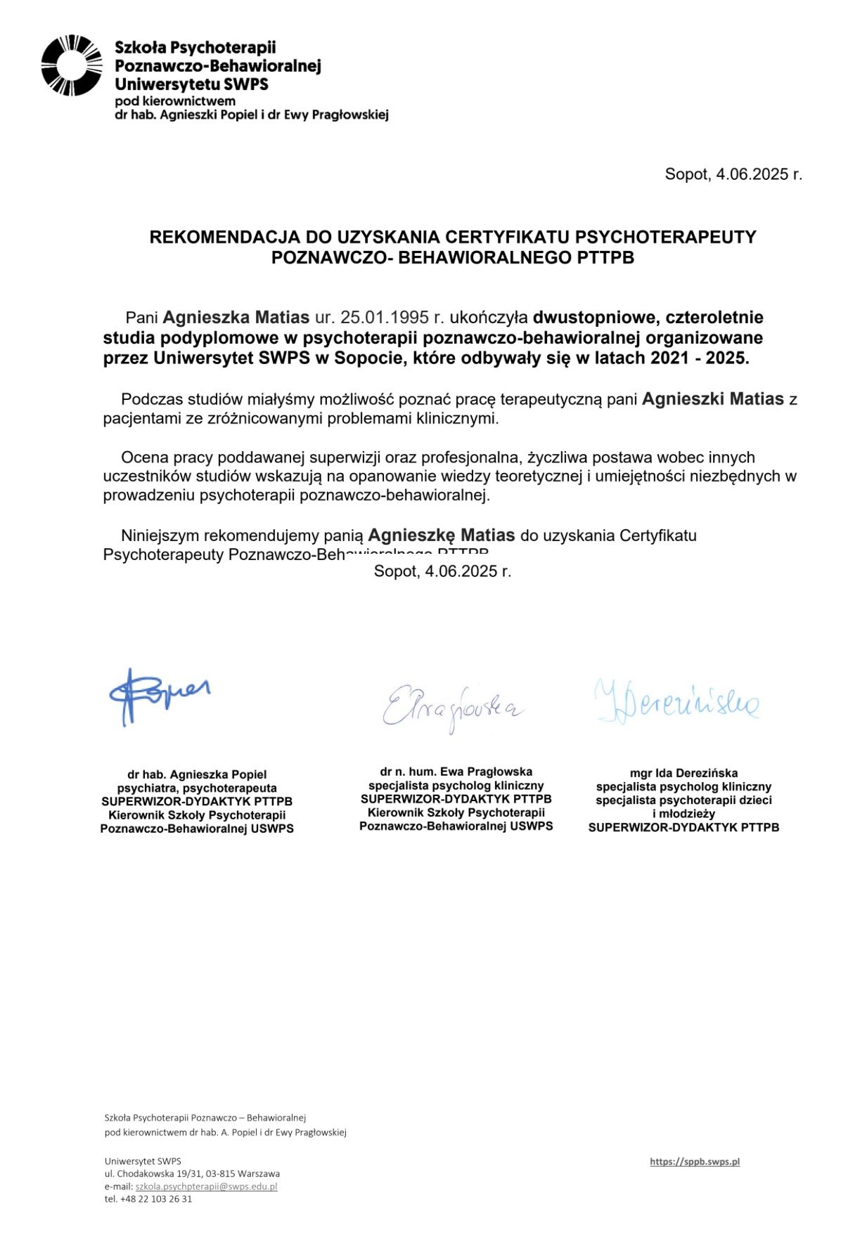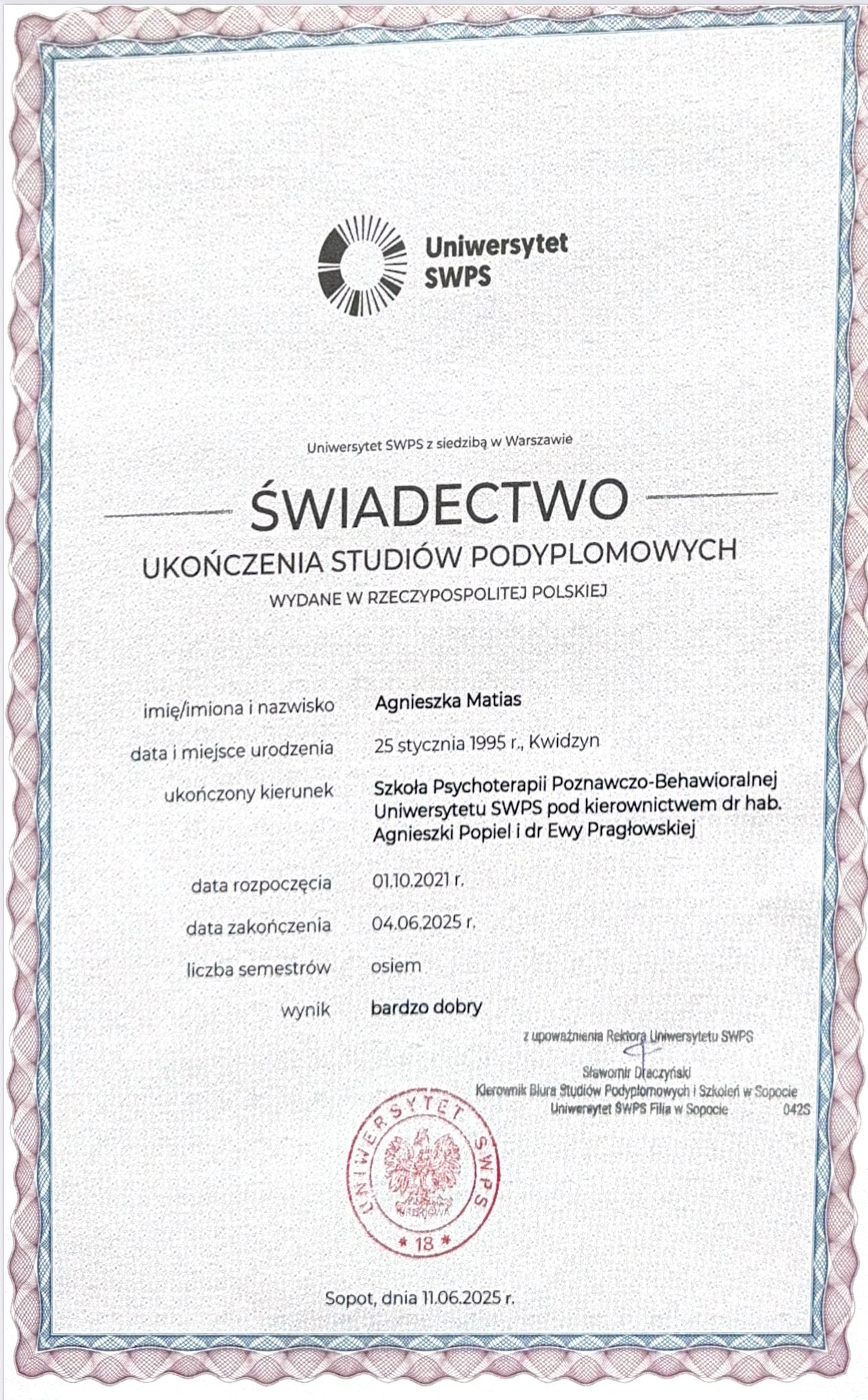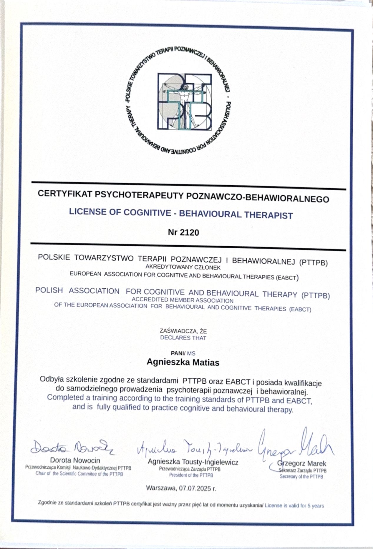Jestem psycholożką oraz psychoterapeutką poznawczo-behawioralną (Certyfikat Psychoterapeuty poznawczo-behawioralnego PTTPB nr 2120). Z wyróżnieniem ukończyłam psychologię ze specjalnością kliniczną na Uniwersytecie Kazimierza Wielkiego w Bydgoszczy oraz 4 letnią Szkołę Psychoterapii Poznawczo Behawioralnej na Uniwersytecie SWPS w Sopocie.