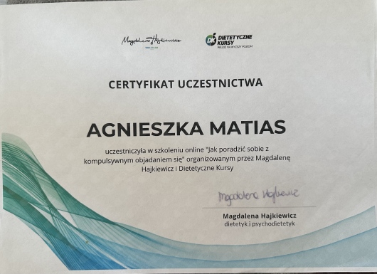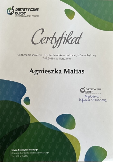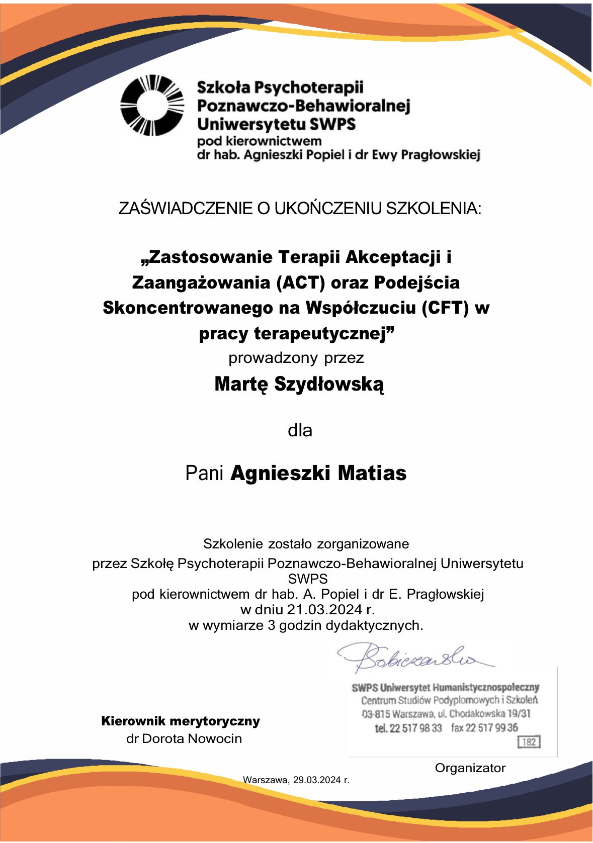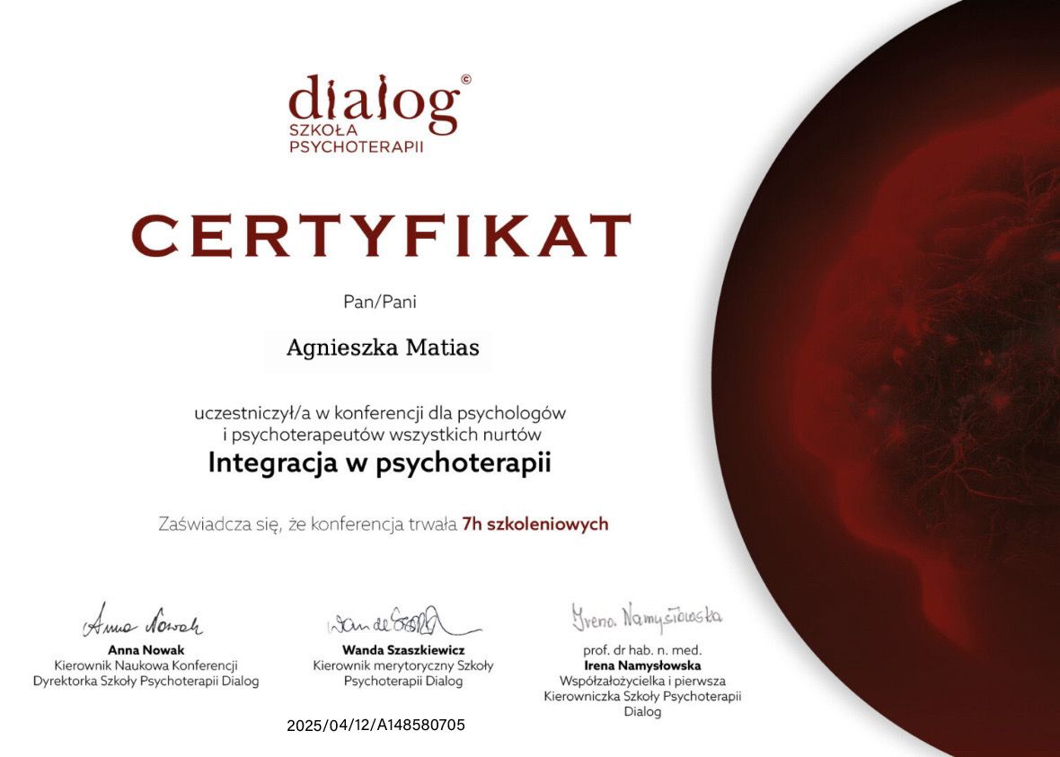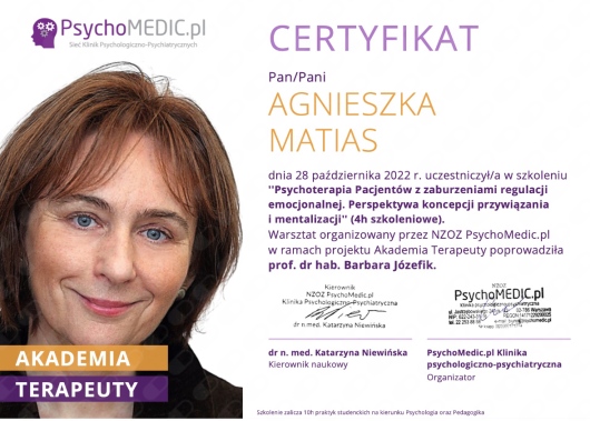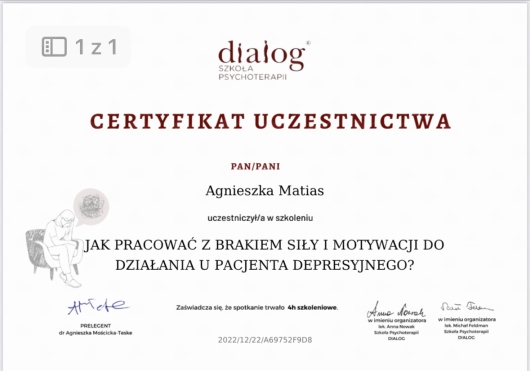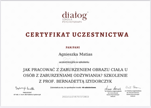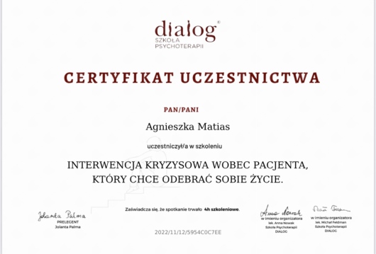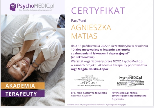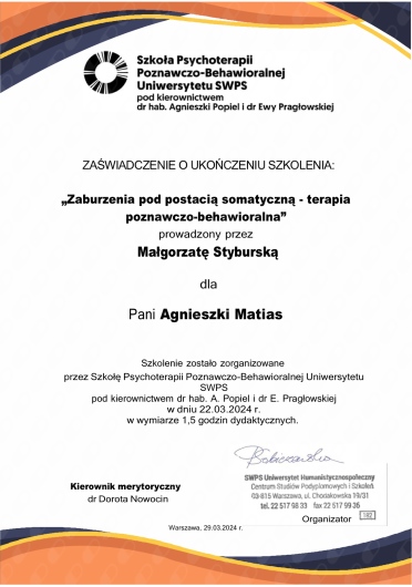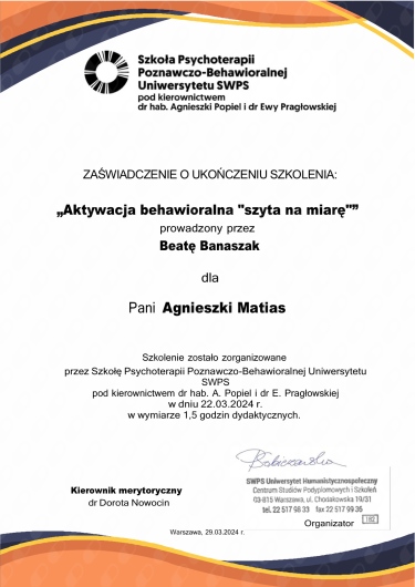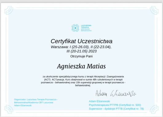 Jestem członkiem Polskiego Towarzystwa Psychoterapii Poznawczo Behawioralnej. Swoje kwalifikacje zawodowe na bieżąco podwyższam uczestnicząc w szkoleniach, kursach oraz konferencjach naukowych. M.in.: