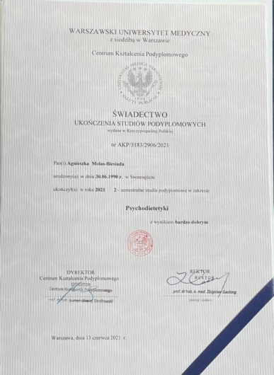 Czy Agnieszka Molas-Biesiada przyjmuje online, bez konieczności pojawiania się w placówce?Tak, Agnieszka Molas-Biesiada oferuje konsultacje online. Wybierz opcję „konsultacja online” przy umawianiu wizyty, a zobaczysz dostępne terminy.