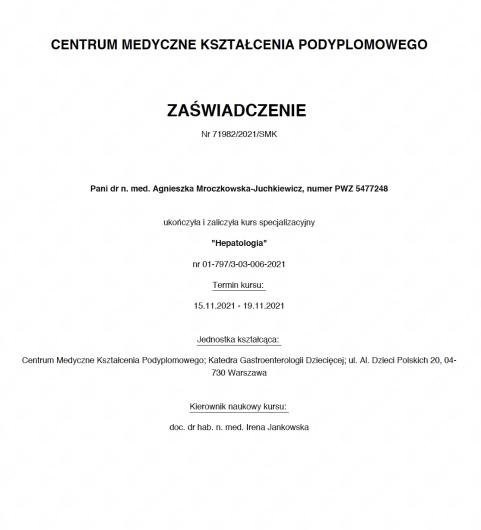 Pani Doktor jest bardzo kompetentna, posiada ogromną wiedzę i doświadczenie, jest lekarzem prowadzącym mojej córki, diagnoza celiakia, udziela nam wielu szczegółowych porad i efekty w poprawie stanu zdrowia córki są bardzo dobre, także polecam!