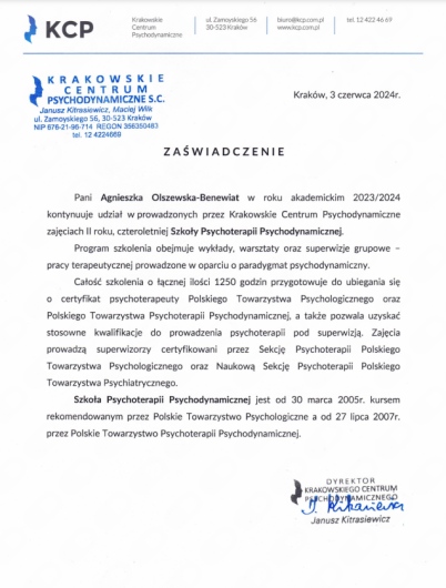 Jestem pedagogiem, psychologiem oraz psychoterapeutką. Ukończyłam studia magisterskie na warszawskim wydziale Psychologii Uniwersytetu SWPS, obecnie jestem w trakcie certyfikacji w Krakowskim Centrum Psychodynamicznym.