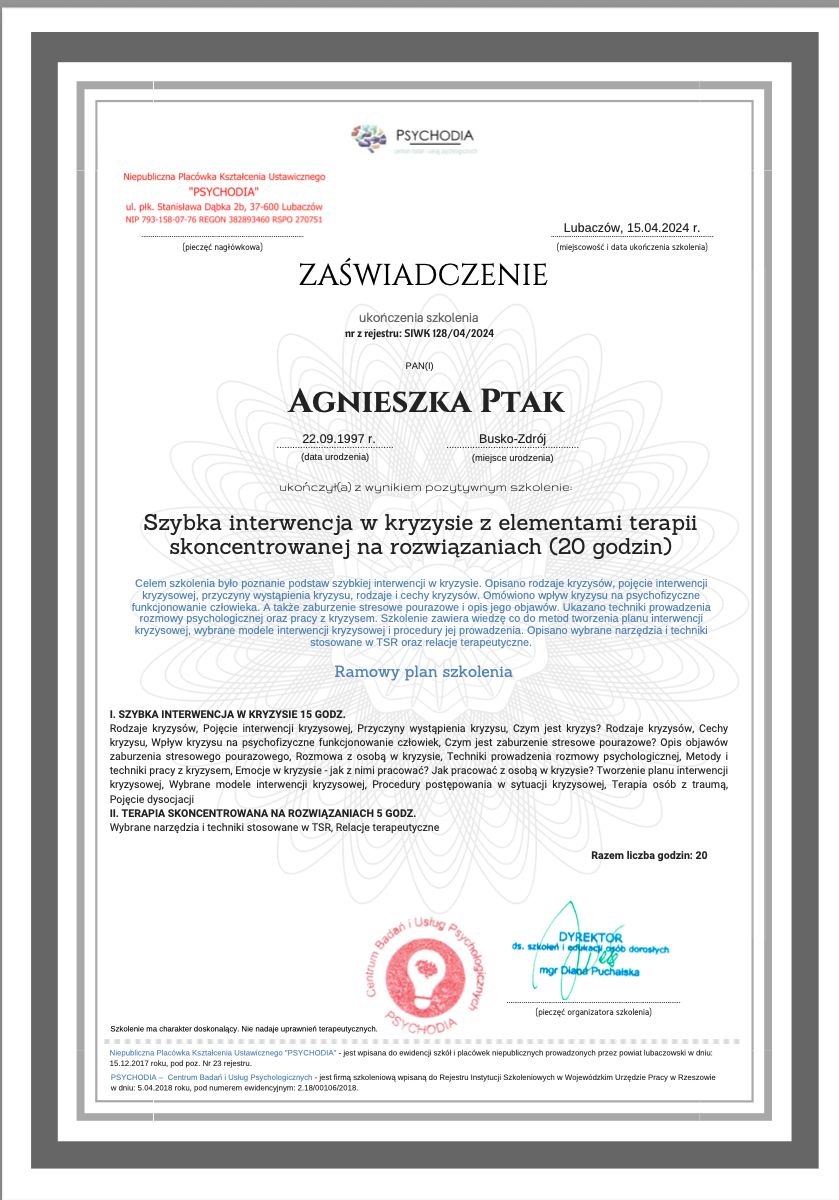 Jestem dyplomowanym psychologiem. Swoją pracę opieram na podejściu poznawczo behawioralnym, uzupełnionym o elementy interwencji kryzysowej i terapii ACT, które dedykowane jest szczególnie dla osób z obniżonym poczuciem własnej wartości, zaburzeniami lękowymi, zaburzeniami osobowości, depresją, będącymi w kryzysie psychicznym. Posiadam także doświadczenie branży szkoleniowej oraz coachingu. Ukończyłam 5-letnie, magisterskie studia psychologiczne (SWPS), 3-letnie, licencjackie studia z zakresu psychokryminalistyki oraz liczne kursy, głównie z zakresu przeciwdziałania przemocy oraz przemocy w rodzinie. Obecnie poszerzam swoją wiedzę w zakresie seksuologii. Prowadzę indywidualną terapię psychologiczną, w toku której pomagam budować świadomość własnych emocji, przekonań i zachowań. Wspieram też w dążeniu do zwiększania poczucia satysfakcji w różnych obszarach życia. Pracuję z młodzieżą oraz dorosłymi. Swoją pracę terapeutyczną opieram na zaangażowaniu i świadomym słuchaniu potrzeb. Doświadczenie zdobywałam w instytucjach publicznych zajmujących się wsparciem rodzin w trudnych sytuacjach życiowych, pomocą w zakresie poradnictwa, terapii, doradztwa i edukacji oraz w pracy indywidualnej z pacjentem. Swoją pracę poddaję regularnej superwizji.