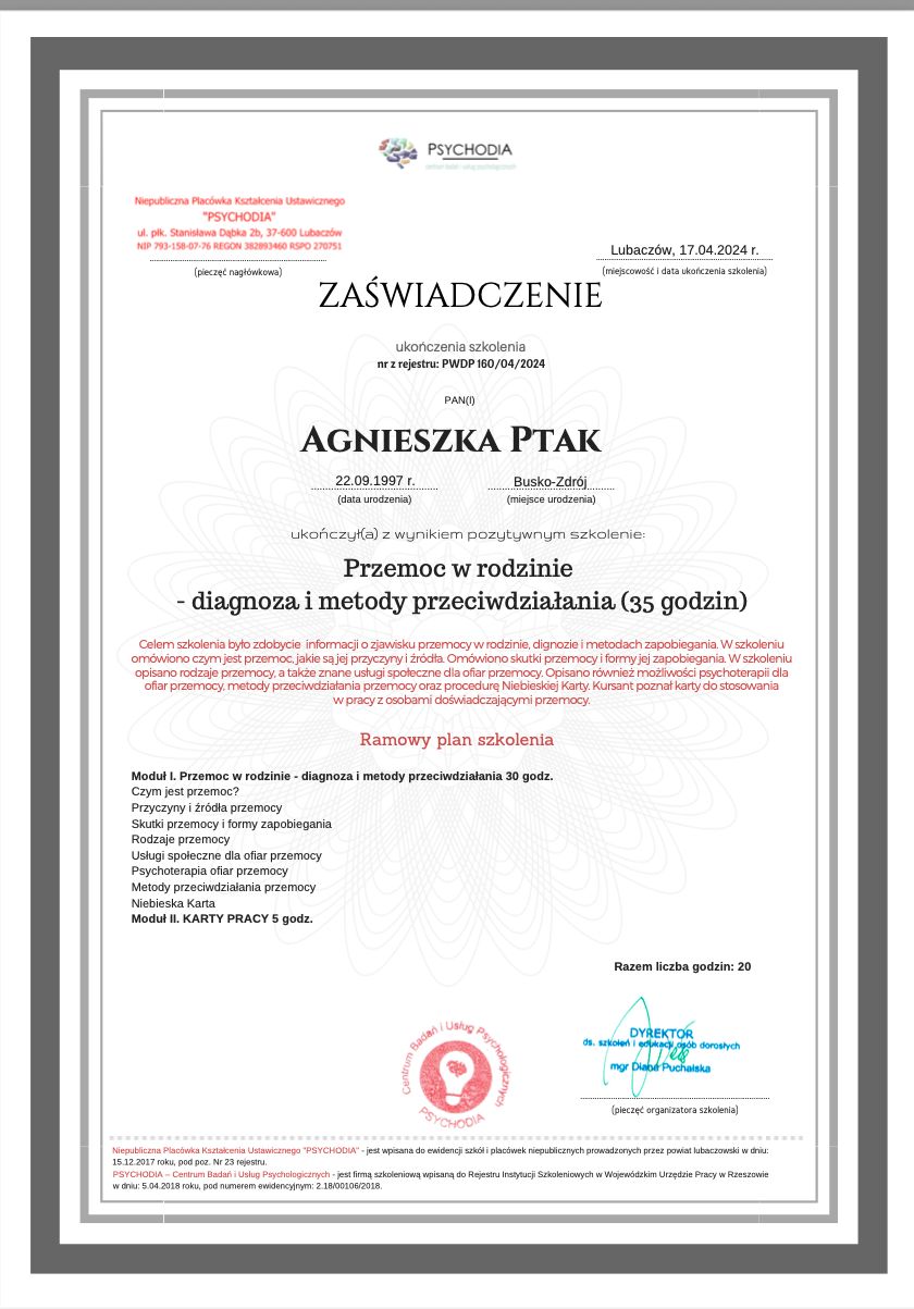 Pani Agnieszka ma swietne podejscie do pacjenta. Bardzo duzo empatii i zrozumienia. Po rozmowie od razu mozna poczuc sie lepiej i lzej.