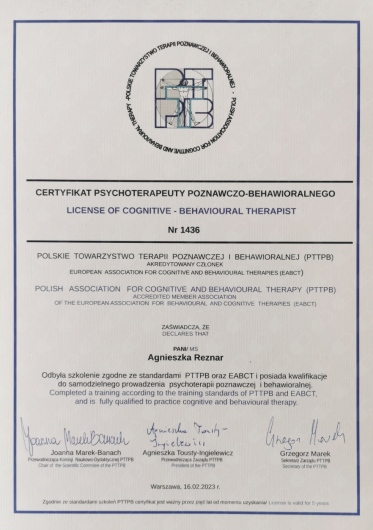 Jestem mgr psychologii oraz certyfikowaną psychoterapeutką poznawczo behawioralną. Pracuję w nurcie poznawczo - behawioralnym z elementami terapii schematów z osobami cierpiącymi m.in. na depresję, lęki, zaburzenia obsesyjno-kompulsywne, zaburzenia osobowości, napady paniki, mającymi problem z obniżonym nastrojem, przewlekłym smutkiem, niskim poczuciem własnej wartości, wyrażaniem i dbałością o swoje potrzeby, DDA i DDD. Wspieram klientów w procesie zdrowienia polegającym na przywróceniu równowagi psycho-fizycznej opartej na zrozumieniu swoich emocji i potrzeb oraz nauczeniu się dbałości o siebie samych. Jestem psychologiem oraz certyfikowaną psychoterapeutką poznawczo-behawioralną (nr certyfikatu 1436 Polskie Towarzystwo Terapii Poznawczo - Behawioralnej). Odbyłam całościowy kurs specjalistyczny psychoterapii zakończony egzaminem w ośrodku Centrum CBT-EDU - placówka ta posiada rekomendacje Polskiego Towarzystwa Terapii Poznawczej i Behawioralnej (PTTPB) – jest członkiem European Association for Behavioral and Cognitive Theapies (EABCT). Ponadto posiadam dyplom studiów z zakresu life coachingu i doradztwa zawodowego - SWPS w Warszawie oraz uprawnienia trenera grupowego International Trainers and Facilitators Federation. Mam ponad 15 - letnią praktykę zawodową. Doświadczenie zawodowe zdobywałam m.in. w Szpitalu Wolskim im. dr Anny Gostyńskiej w Warszawie, w Mazowieckim Szpitalu Bródnowskim na Oddziałach Psychiatrycznych Dziennych i Całodobowych, w klinice świadczącej konsultacje psychologiczno-psychiatryczne Psycho-Medic w Warszawie oraz w wielu innych placówkach opieki zdrowotnej. Jestem członkiem Polskiego Towarzystwa Psychoterapii Poznawczo-Behawioralnej. Pracuję zgodnie z Kodeksem Etycznym Psychologa. Swoją pracę poddaję superwizji. Prowadzę Poradnię KuLepszemu w Warszawie, w niej też obecnie przyjmuję pacjentów. Wizytę można umówić przez ZL lub bezpośrednio przez stronę Poradni KuLepszemu. Zapraszam serdecznie, Agnieszka Reznar
