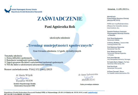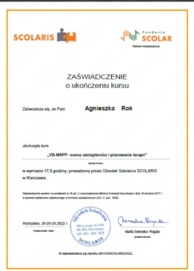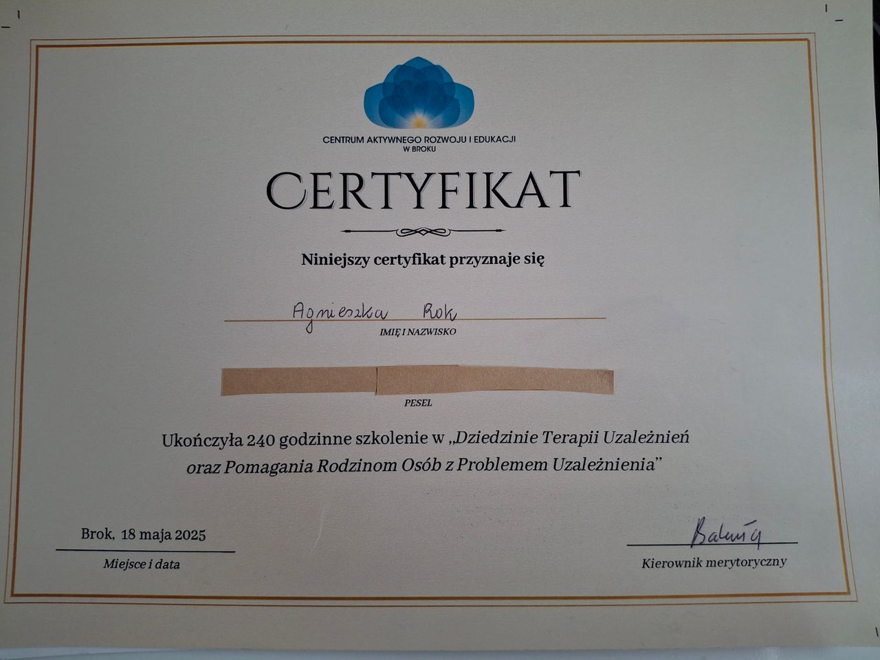 Ukończyłam szkolenie w zakresie terapii uzależnień w Szkole Care Brok dla Specjalistów Psychoterapii Uzależnień.