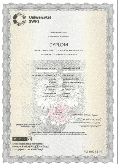 Ukończyłam Wydział Psychologii Uniwersytetu SWPS w Warszawie - specjalność „Psychologia kształtowania i zmiany zachowania" z tytułem magistra psychologii.