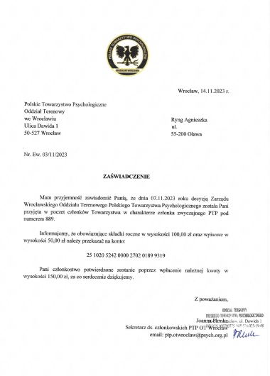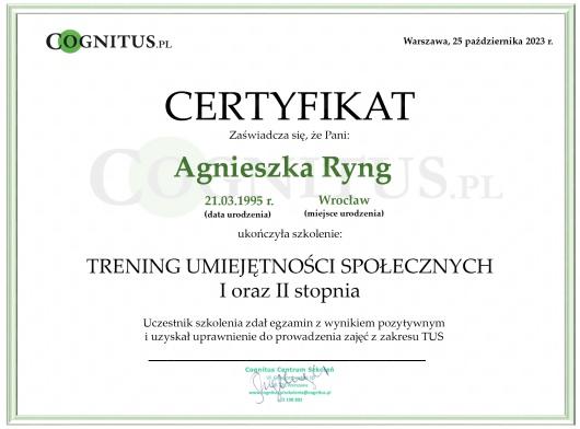 Ukończyłam studia magisterskie z Psychologii w Dolnośląskiej Szkole Wyższej we Wrocławiu o specjalności Psychologia zdrowia. Posiadam także dyplom ukończenia studiów pedagogicznych na kierunku Edukacja Wczesnoszkolna i Wychowanie Przedszkolne. Jestem członkiem zwyczajnym Polskiego Towarzystwa Psychologicznego i certyfikowanym trenerem TUS I i II stopnia (treningu umiejętności społecznych). Doświadczenie zdobywałam pracując z pacjentami indywidualnymi, dziećmi w placówkach przedszkolnych, integracyjnej szkole podstawowej a także podczas praktyk m.in. w Zakładzie Opiekuńczo Leczniczym oławskiego szpitala. Zajmuję się pomocą psychologiczną dzieci, młodzieży i dorosłych doświadczających różnych trudności życiowych. Udzielam konsultacji, wsparcia psychologicznego i prowadzę indywidualną terapię psychologiczną. Pracuję w oparciu o Kodeks Etyczny Psychologa Polskiego Towarzystwa Psychologicznego.