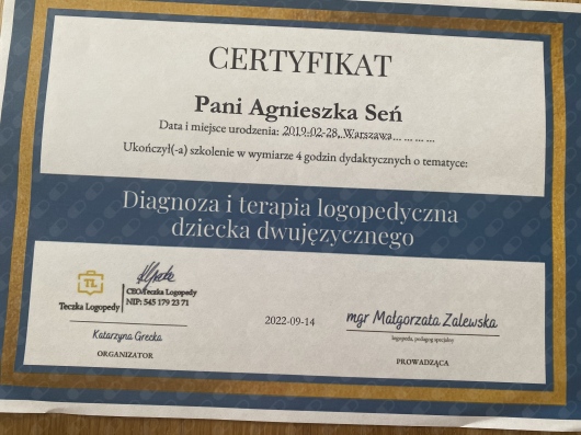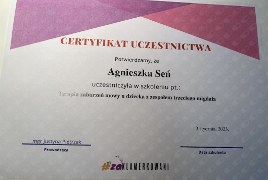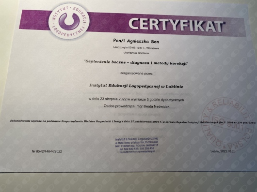 Pani Agnieszka jest niezwykle profesjonalnym i zaangażowanym logopedą ze świetnym podejściem do dziecka. Bardzo się cieszę, że do niej trafiliśmy.