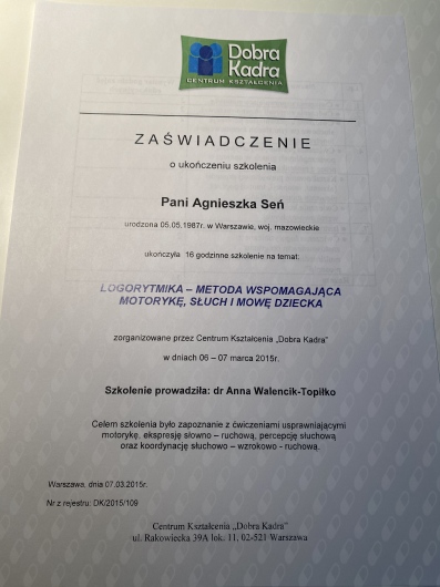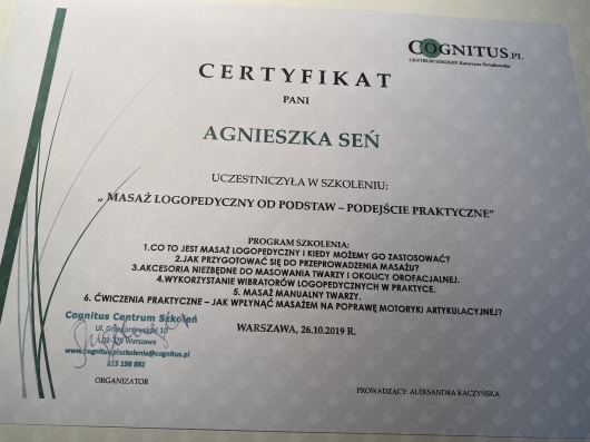 Pani Agnieszka jest doskonałym logopedą ze wspaniałym podejściem do dzieci. W 2 miesiące terapii nasz 6-letni syn dokonał ogromnych postępów (pozostaje teraz w zasadzie tylko praca własna). Zajęcia z Panią Agnieszką są dla dzieci atrakcyjne z uwagi na użycie elementów multimedialnych. Pani Agnieszka, mimo że bardzo przyjazna i ciepła dla dzieci, potrafi zarządzić koncentracją dziecka przez całą godzinę (co nie jest jest łatwe). Polecamy z czystym sumieniem!