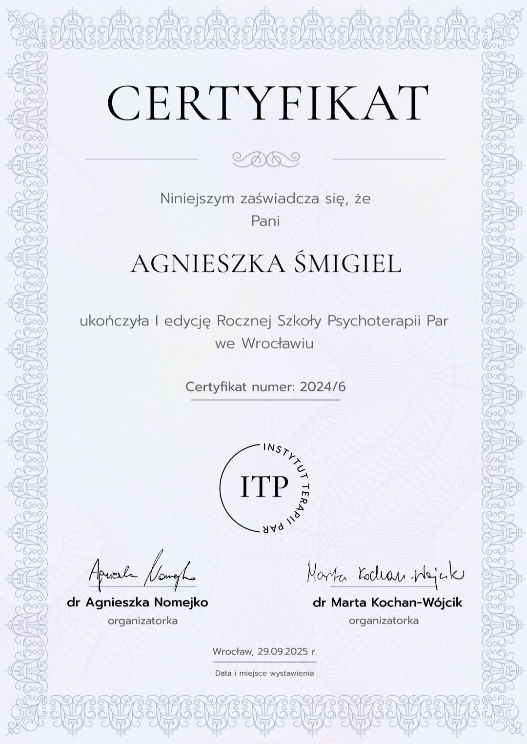 Jaki jest zakres porad oferowanych przez Agnieszka Śmigiel?Agnieszka Śmigiel to psycholog, seksuolog, farmaceuta. Na podstawie swojego doświadczenia i wykształcenia Agnieszka Śmigiel oferuje usługi takie jak: konsultacja partnerska, konsultacja seksuologiczna dla par, Konsultacja psychologiczna, Terapia par (krótsza), Terapia par (dłuższa), konsultacja seksuologiczna, konsultacja online.