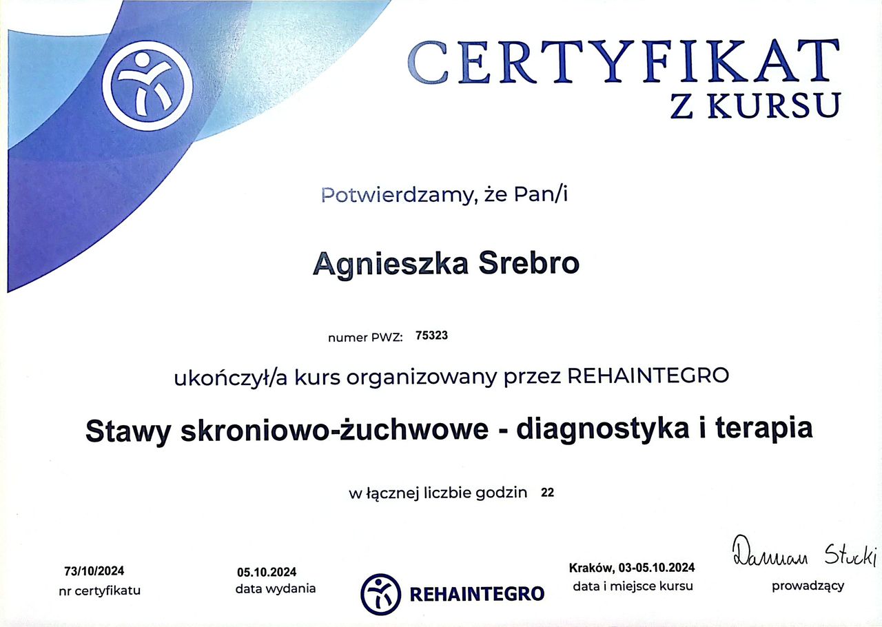 Jaki jest zakres porad oferowanych przez Agnieszka Srebro?Agnieszka Srebro to fizjoterapeuta. Na podstawie swojego doświadczenia i wykształcenia Agnieszka Srebro oferuje usługi takie jak: konsultacja fizjoterapeutyczna, Diagnostyka + Terapia Manualna, Fizjoterapia z wykorzystaniem technik osteopatycznych, Konsultacja fizjoterapeutyczna z elementami osteopatii i terapii wisceralnej.