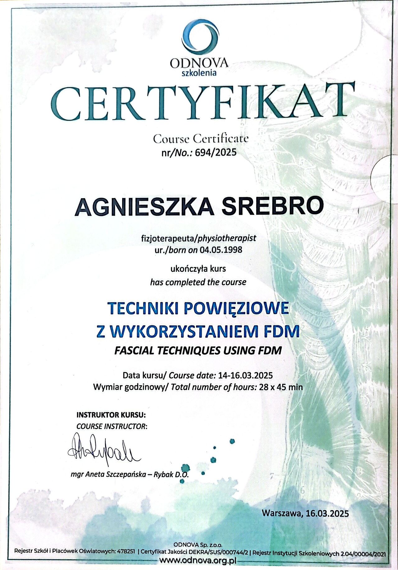 Od około roku próbowałam pozbyć się bólu w okolicach szyi/barku. Rozciągałam się, ćwiczyłam yogę itp. ale dyskomfort w tych okolicach nadal mi doskwierał. Postanowiłam, że umówię sie do Pani Agnieszki. Już po spotkaniu zauważyłam dużą poprawę – mogę swobodniej ruszać głową, a napięcie praktycznie zniknęło. Pani Agnieszka podeszła do problemu holistycznie, dokładnie przeanalizowała sytuację. Bardzo profesjonalna i zaangażowana fizjoterapeutka. Polecam każdemu, kto szuka realnej pomocy!