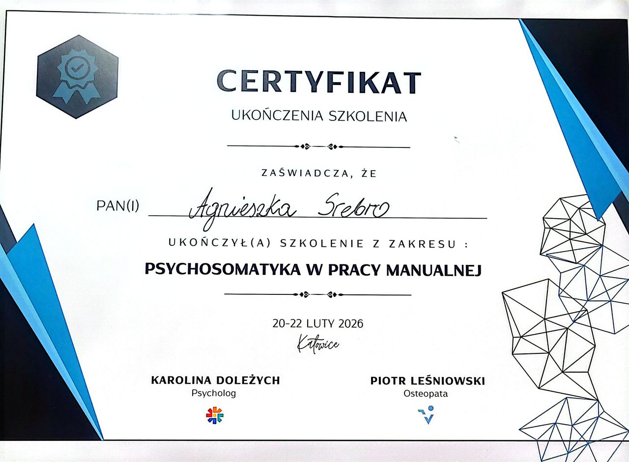 Z całego serca polecam Panią Agnieszkę, bo jestem niezwykle zadowolona z naszej współpracy. Była to pierwsza osoba, która z uwagą i bez pośpiechu wysłuchała mojej historii zdrowotnej i z cierpliwością odpowiadała na najbardziej prozaiczne, ale ważne dla mnie pytania. Jestem ogromnie wdzięczna za zaangażowanie, ktore włożyła Pani Agnieszka, aby pomóc mi odzyskać sprawność i lepsze samopoczucie. Pani Agnieszka oprócz ogromu wiedzy i profesjonalnej postawy również zaopiekowała mnie emocjonalnie i okazała ogrom ciepła i empatii. Jestem też bardzo zadowolona z tego, że Pani Agnieszka nauczyła mnie elementów autoterapii, co pomogło mi lepiej zrozumieć własne ciało i szybciej wrócić do zdrowia.