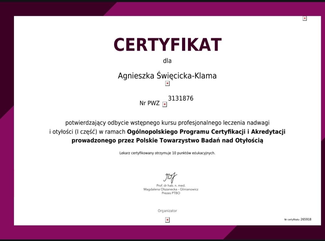Jako certyfikowana lekarka z zakresu obesitologii prowadzę profilaktykę, diagnostykę oraz leczenie choroby otyłościowej w Centrum Terapii Nadwagi i Otyłości Ovo Medical we Wrocławiu. Posiadam również certyfikację Międzynarodowego Towarzystwa Menopauzy (International Menopause Society) IMPART w zakresie leczenia menopauzy.