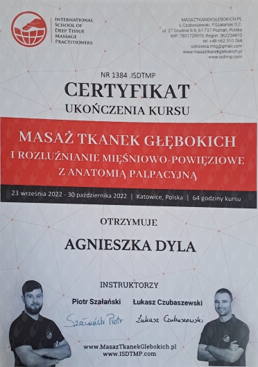 Bardzo polecam Agnieszkę! Byłam na 1 masażu leczniczym z bólem dolnej części pleców, początkowo nie poczułam spektakularnej różnicy, ale już na drugi dzień ból w dużej mierze zniknął. Agnieszka ma bardzo dużo wiedzy, która się chętnie dzieli i jest bardzo zaangażowana w to co robi. Na pewno przyjdę ponownie :)