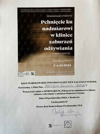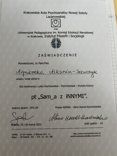 Posiadam tytuł magistra psychologii Uniwersytetu Jagiellońskiego. Uczestniczę w pracach seminaryjnych na temat kliniki oraz w zajęciach organizowanych przez Szkołę Włoską „Scuola Lacaniana di Psicoanalisi del Campo Freudiano” i Instituto Freudiano. Jestem w superwizji.