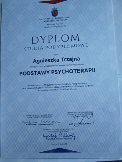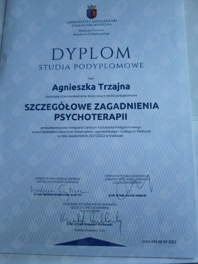 W 2022 roku ukończyłam czteroletnie szkolenie psychoterapeutyczne prowadzone przez Collegium Medicum Uniwersytetu Jagiellońskiego. Pracując w podejściu psychodynamicznym, staram się dostosować narzędzia i metody terapii do indywidualnych potrzeb pacjentów. W swojej pracy towarzyszę w rozwiązywaniu wewnętrznych konfliktów, trudnych emocji oraz w budowaniu zdrowszych mechanizmów radzenia sobie z codziennym stresem i wyzwaniami. Pomagam również osobom z depresją, nerwicą lękową, zaburzeniami osobowości oraz przeżywającym zespół stresu pourazowego.