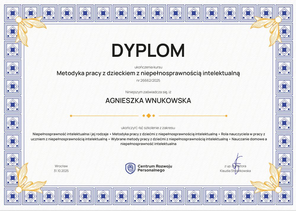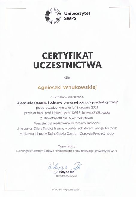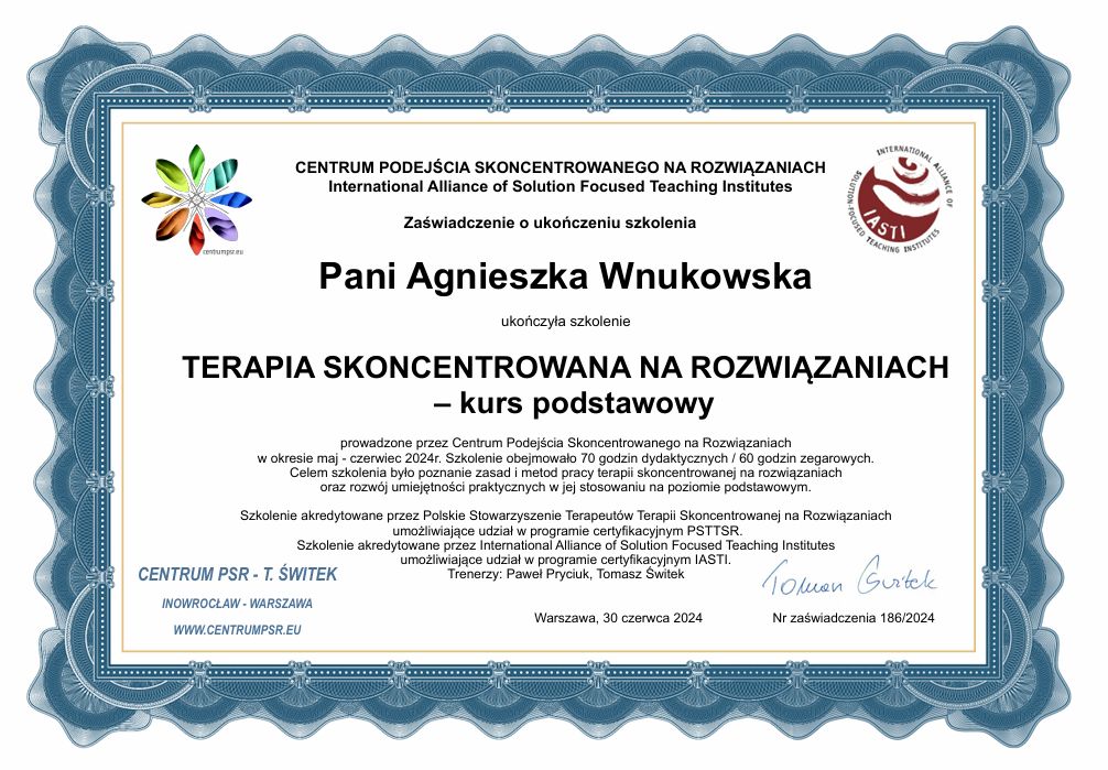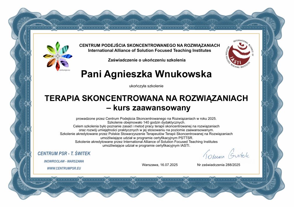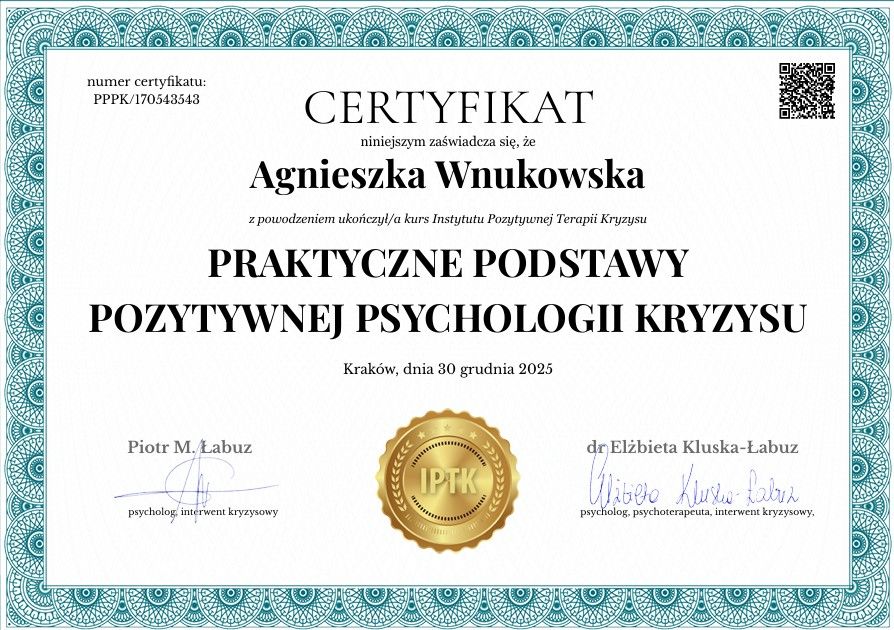 Pani Agnieszka Wnukowska to psycholog o ogromnej empatii, profesjonalizmie i uważności. Potrafi stworzyć atmosferę zaufania i bezpieczeństwa, w której łatwiej zrozumieć siebie i swoje emocje. Jej spokój, mądrość i ciepło sprawiają, że spotkania z Nią stają się prawdziwym wsparciem i inspiracją do pozytywnych zmian. Z całego serca polecam współpracę z Panią Agnieszką każdemu, kto szuka życzliwego i skutecznego wsparcia psychologicznego.