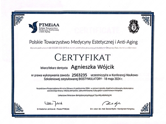Jestem certyfikowanym lekarzem medycyny estetycznej, a dyplom uzyskałam po dwóch latach studiów na prestiżowym University of Greenwich w Londynie. Umiejętności doskonaliłam w USA (North Carolina University at Chapel Hill), w Anglii, we Włoszech oraz Szwecji. Całe moje zawodowe życie poświęcam estetyce, studiowaniu i budowaniu proporcji i holistycznemu podejściu do starzenia się (także poprzez dietę i zmianę stylu życia).