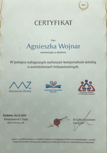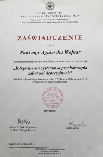 Po kilku miesiącach wizyt u Pani Agnieszki mogę śmiało powiedzieć, że jestem bardzo zadowolona z przebiegu terapii. Wizyty były zawsze prowadzone w przyjaznej, profesjonalnej i komfortowej atmosferze. Pani Agnieszka potrafi wysłuchać i trafnie podsumować rzeczy, które samemu czasem ciężko jest dostrzec. Serdecznie polecam.
