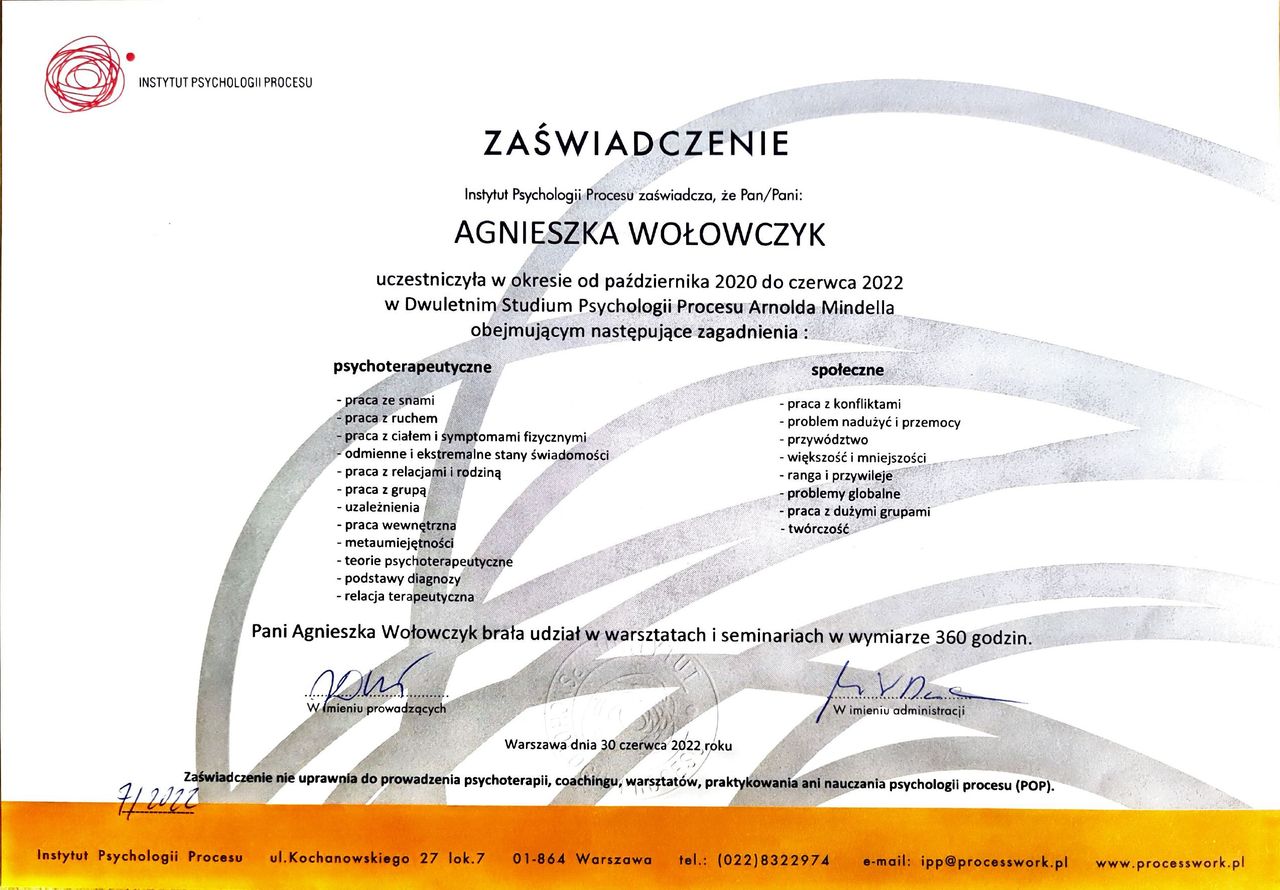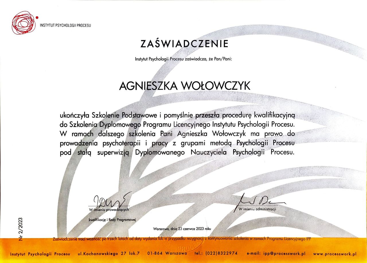 Jestem psychoterapeutką nurtu psychologii zorientowanej na proces w trakcie certyfikacji. Pracuję pod stałą superwizją indywidualną oraz regularnie uczestniczę w superwizji grupowej. Od 2020 roku jestem członkinią Polskiego Stowarzyszenia Psychoterapeutów i Praktyków Psychologii Procesu (PTPiPPP).