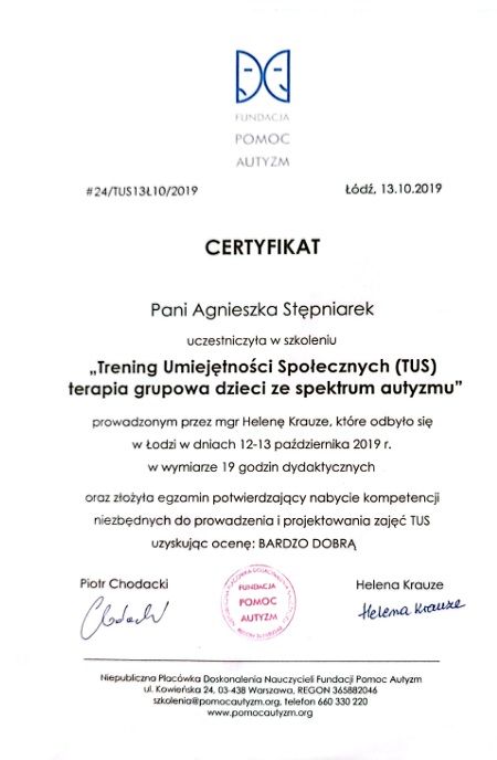 Systematycznie uczęszczam na szkolenia psychologiczno - psychoterapeutyczne ze Szkoły Psychoterapii Dialog oraz skończyłam kurs TSR 1 w szkole Integri TSR.