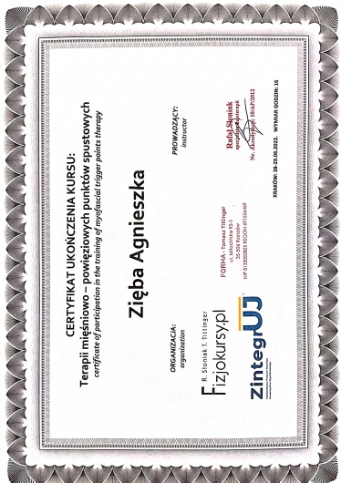 Ukończyłam pięcioletnie studia magisterskie na Uniwersytecie Jagiellońskim Collegium Medicum, wiele certyfikowanych kursów z zakresu fizjoterapii oraz treningu, jestem również w trakcie studiów podyplomowych na Akademii Osteopatii, a zdobyta wiedza pomaga mi w dokładniejszym diagnozowaniu oraz wyborze odpowiednich technik terapii. Podczas pracy w gabinecie, biorę pod uwagę wszystkie zgłaszane przez Pacjenta problemy, analizuję biomechanicznie całe ciało, wzorce ruchowe oraz występujące zaburzenia, co pozwala mi na tworzenie indywidualnego planu terapii, dostosowanego do aktualnych potrzeb.
