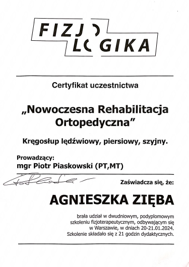 Pani Agnieszka to wyjątkowa specjalistka, łącząca profesjonalizm z ogromną empatią. Trafiłem do niej z dolegliwościami ortopedycznymi i już od pierwszej wizyty wiedziałem, że jestem w dobrych rękach. Dokładnie diagnozuje problem, tłumaczy każdy etap terapii i dobiera ćwiczenia indywidualnie do pacjenta. Dzięki jej wsparciu szybko poczułem znaczną poprawę i odzyskałem sprawność w codziennym życiu. Podczas wizyt panuje przyjazna atmosfera, a pani Agnieszka potrafi zmotywować i dać poczucie bezpieczeństwa. Zdecydowanie polecam każdemu, kto szuka skutecznej i życzliwej fizjoterapeutki ortopedycznej.