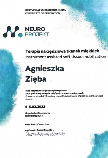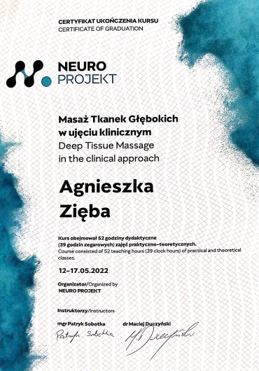 I completed a five-year Master's degree at the Jagiellonian University Medical College, numerous certified courses in physiotherapy and training, and I am currently pursuing postgraduate studies at the Academy of Osteopathy. The knowledge I've gained helps me make more accurate diagnoses and choose the appropriate therapeutic techniques. In my practice, I take into account all the issues reported by the patient, I biomechanically analyze the entire body, movement patterns, and existing dysfunctions, which allows me to create a personalized therapy plan tailored to the current needs.