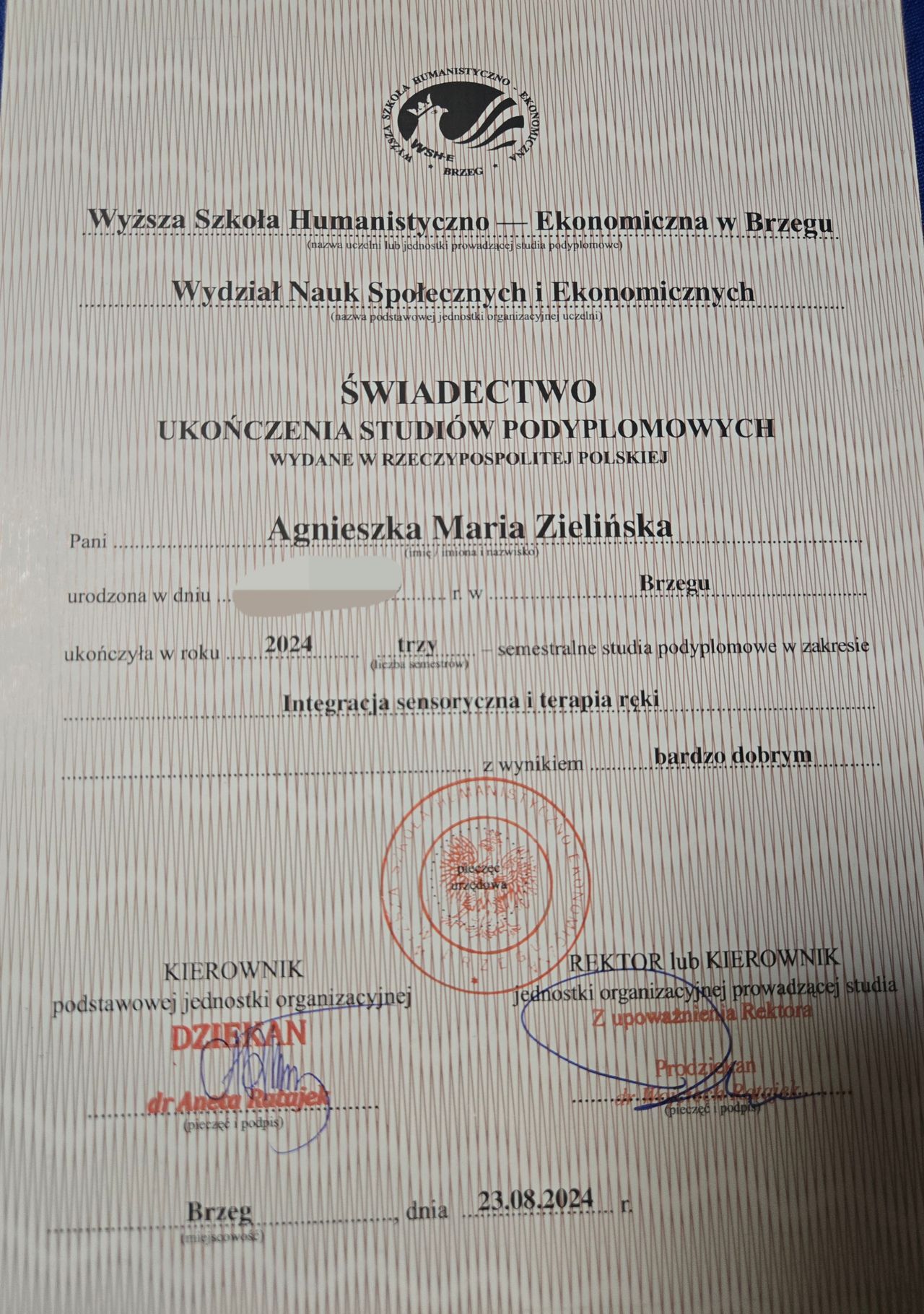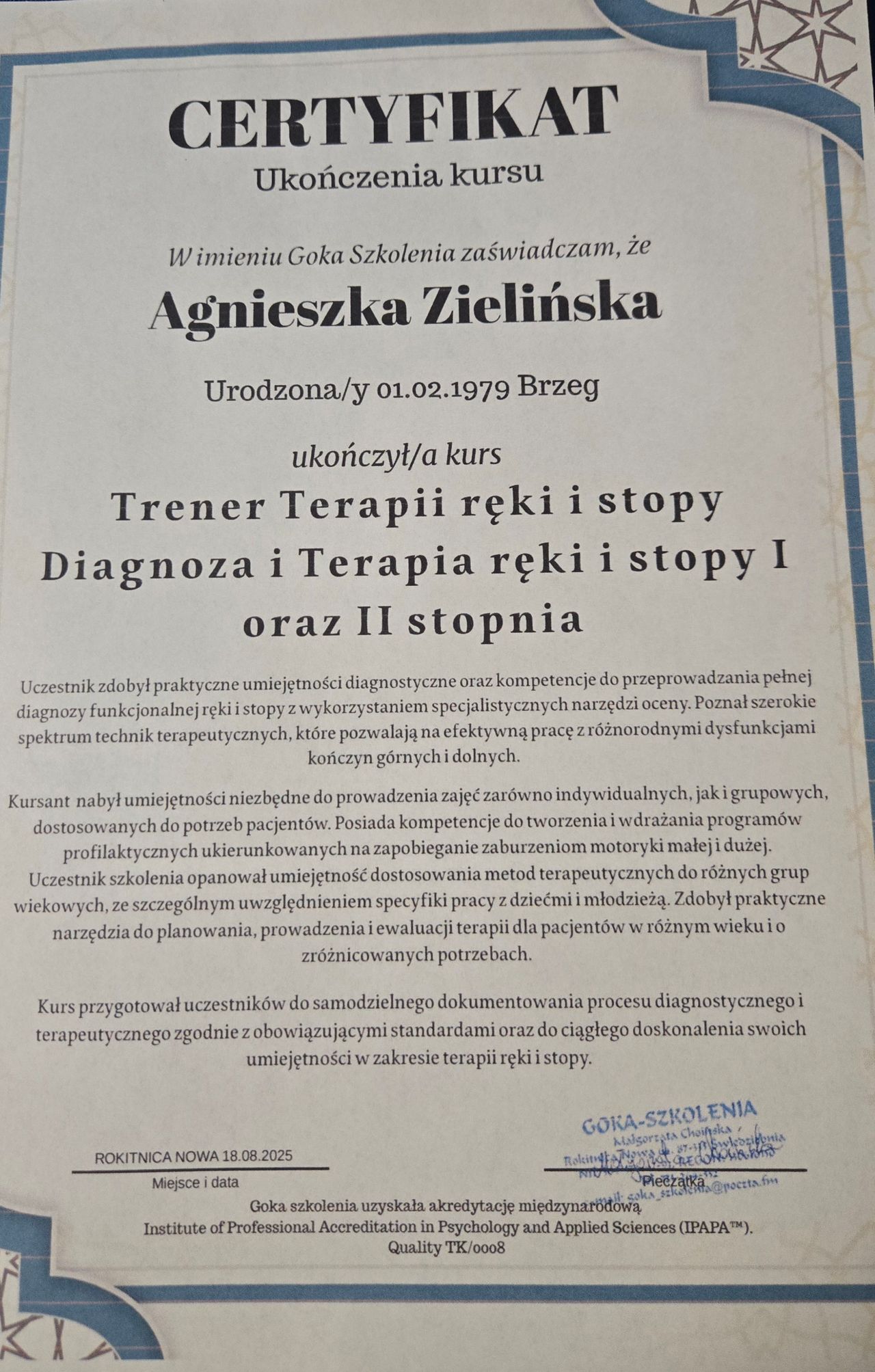 Ponadto jestem terapeutą ręki i integracji sensorycznej.