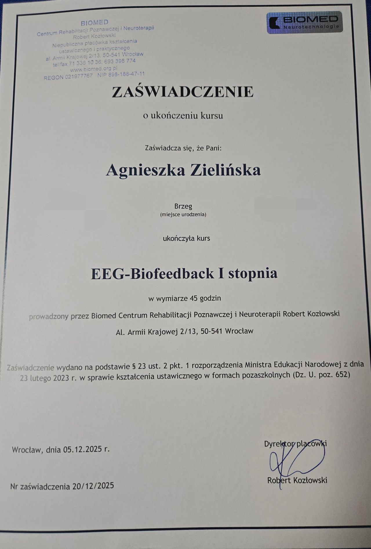 Po wstępnej diagnozie rozpoczęliśmy terapię biofeedback. Diagnoza omówiona szczegółowo, otrzymaliśmy wyczerpujące odpowiedzi na nasze pytania. To dopiero początek drogi, ale myślę, że z zaangażowaniem i przygotowaniem merytorycznym Pani Agnieszki końcowy efekt będzie tym, czego oczekujemy. Lokalizacja gabinetu i jego wyposażenie 5/5.
