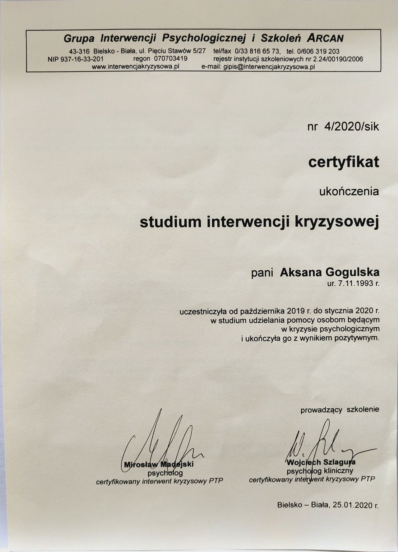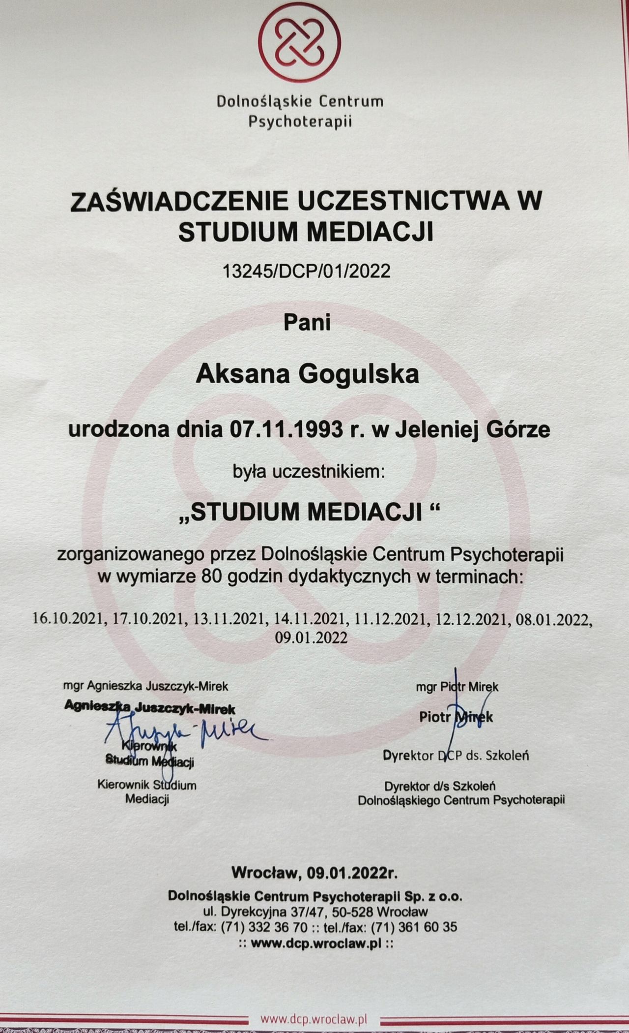 Ukończyłam jednolite studia magisterskie na Uniwersytecie Wrocławskim oraz studia podyplomowe na kierunku Przygotowanie pedagogiczne dla psychologów. Dodatkowo ukończyłam: • Studium interwencji kryzysowej • Studium mediacji • Kurs Mindfulness (Redukcja Stresu za pomocą Uważności) • Specjalistyczny kurs diagnozy psychologicznej. Diagnoza neuropsychologiczna osób dorosłych.