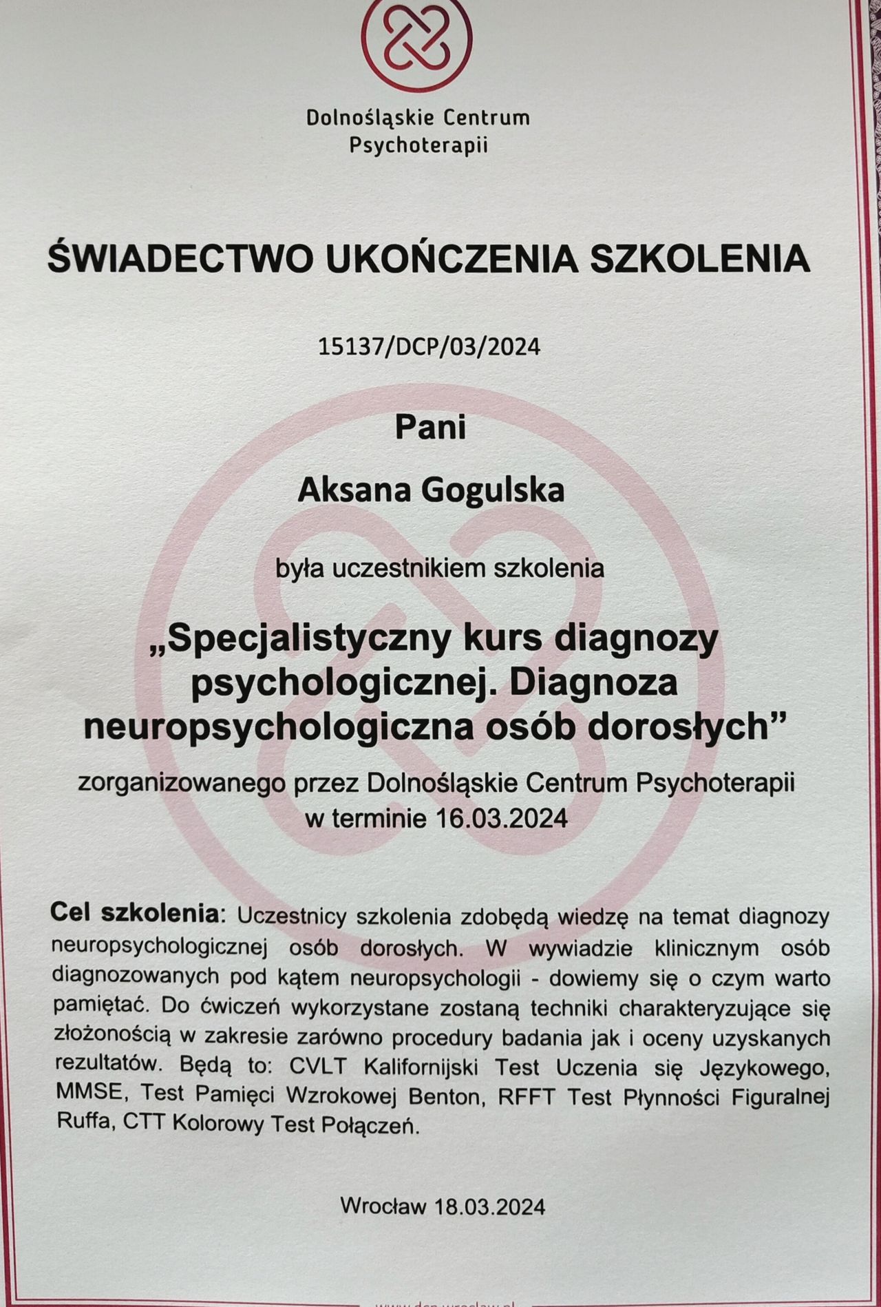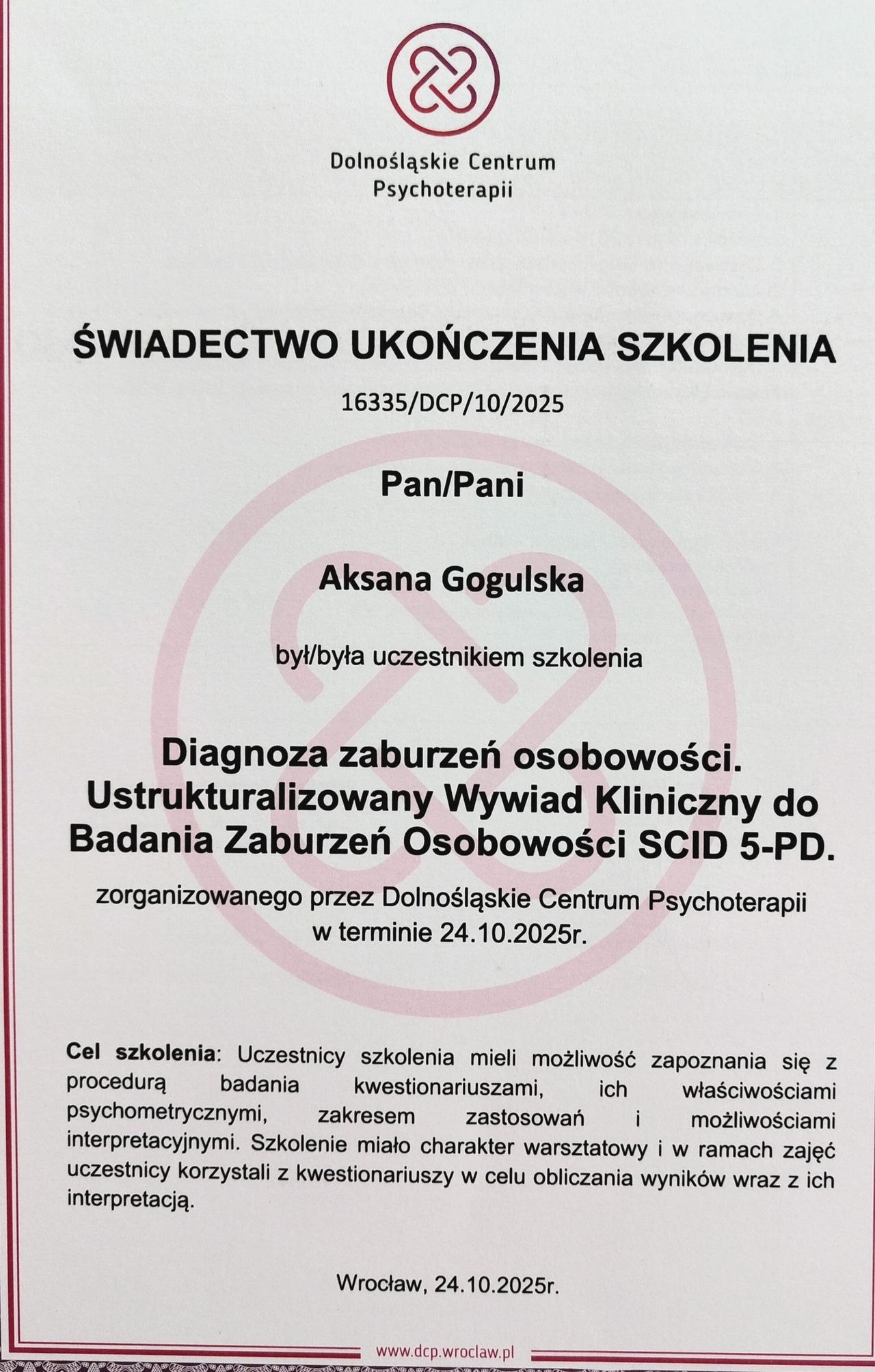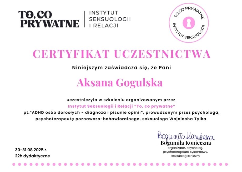 Jaki jest zakres porad oferowanych przez Aksana Gogulska?Aksana Gogulska to psycholog. Na podstawie swojego doświadczenia i wykształcenia Aksana Gogulska oferuje usługi takie jak: Konsultacja psychologiczna, interwencja kryzysowa, poradnictwo psychologiczne, psychoedukacja, diagnoza ADHD dla dorosłych, Diagnoza zaburzeń osobowości - SCID-5-PD, Diagnoza osobowości NEO-PI-R, konsultacja online (pierwsza), coaching, testy psychologiczne.