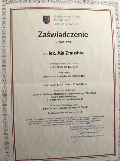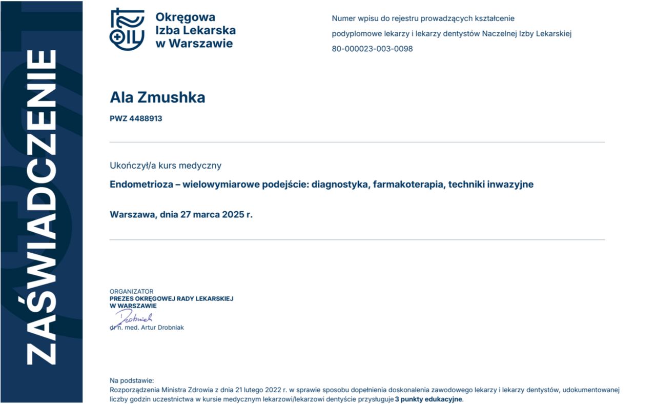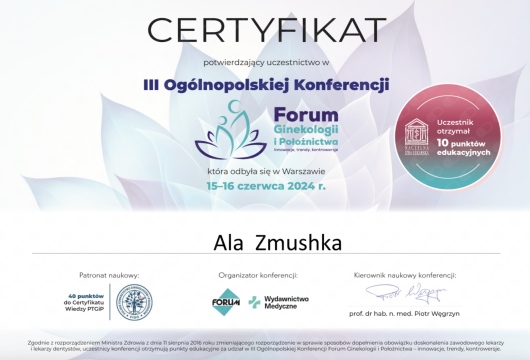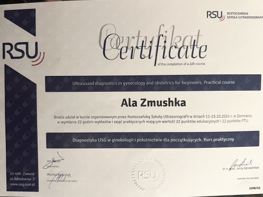 Posiadam Certyfikat RSU o udziale w kurse "Diagnostyka USG w ginekologii i położnictwie" oraz certyfikaty o ukończeniu kursów "Endometrioza", "Mięśniaki macicy" , "Menopauza"