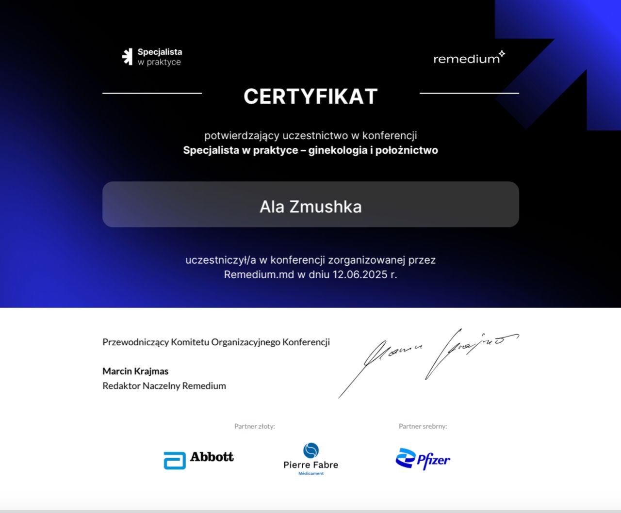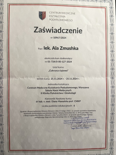 W 2023r. nostryfikowałam dyplom w Uniwersytecie Medycznym w Białymstoku, 03.2024-03.2025 staż podyplomowy w sp. z.o.o. LuxMED