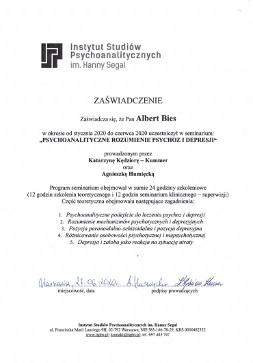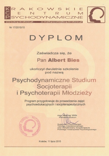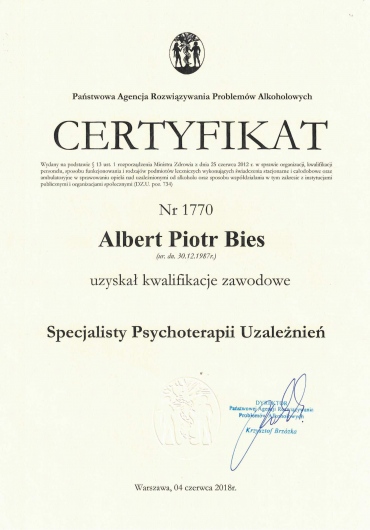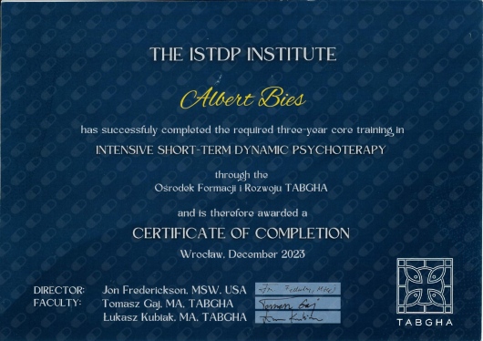 Pan Albert pomógł mi wyjść z depresji, a było ze mną niezbyt dobrze (myśli samobójcze, brak sensu wżyciu, niskie poczucie wartości). Borykałem się z tym od wielu lat. Teraz moje życie wygląda o wiele lepiej. Dokonałem wielu zmian w swoim życiu, czuję się sam ze sobą bardzo dobrze, chce mi się po prostu żyć. Uwolniłem się od bagażu trudnych doświadczeń z mojego dzieciństwa. Pan Albert jest bardzo konkretny, precyzyjnie stawia pytania, ale jednocześnie przy tym bardzo szanuje pacjenta. Czasami nie było łatwo, miałem kryzysy, chciałem rzucić terapię, ale jakoś zawsze razem udawało nam się to omówić i pójść dalej. Z całego serca polecam ;)