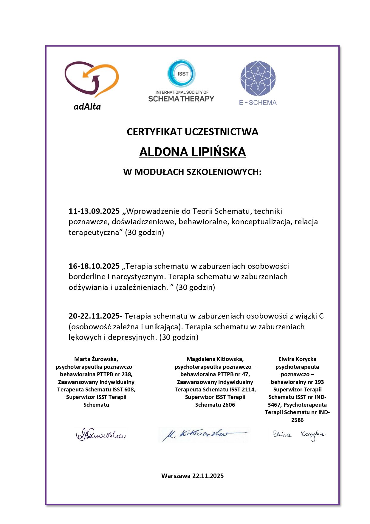 Ukończyłam akredytowane szkolenie z terapii schematu (72h) przeprowadzone przez Magdę Kitlowską, Martę Żurowską i Pawła Górnego. W obszarze terapii schematow uwielbiam pracę wyobrażeniową (opiekowanie się Wrażliwym Dzieckiem, stawianie granic i odsuwanie Krytyka, tworzenie głosu wspierającego).