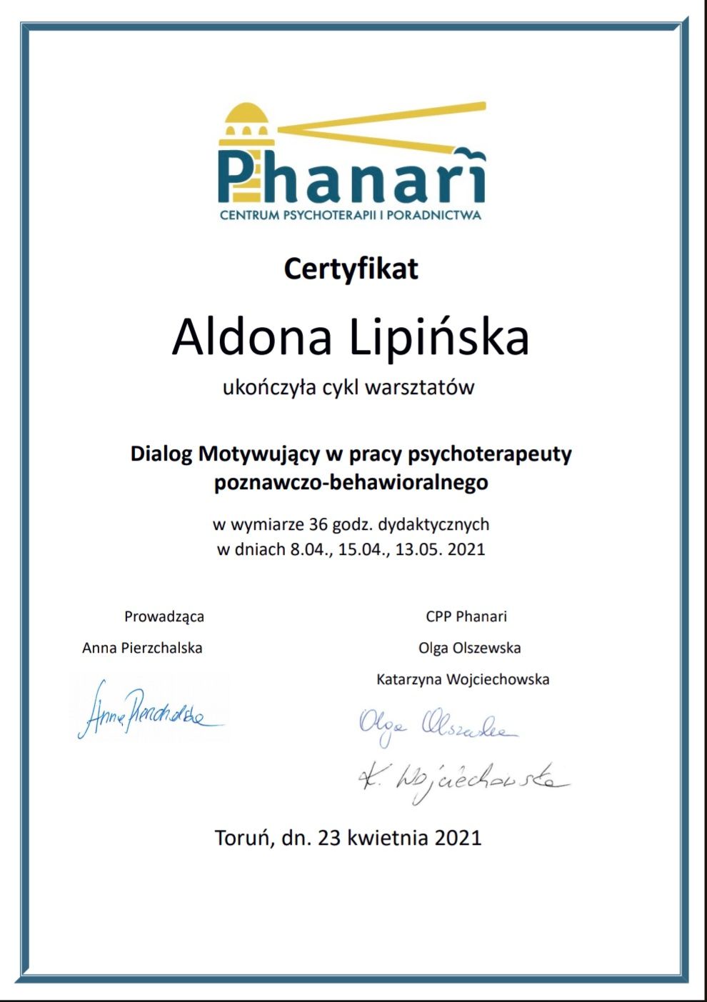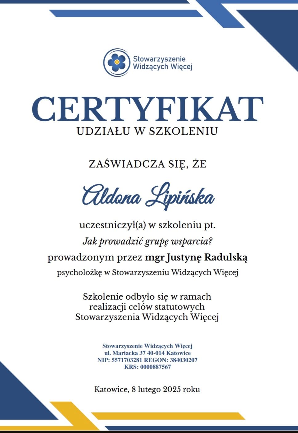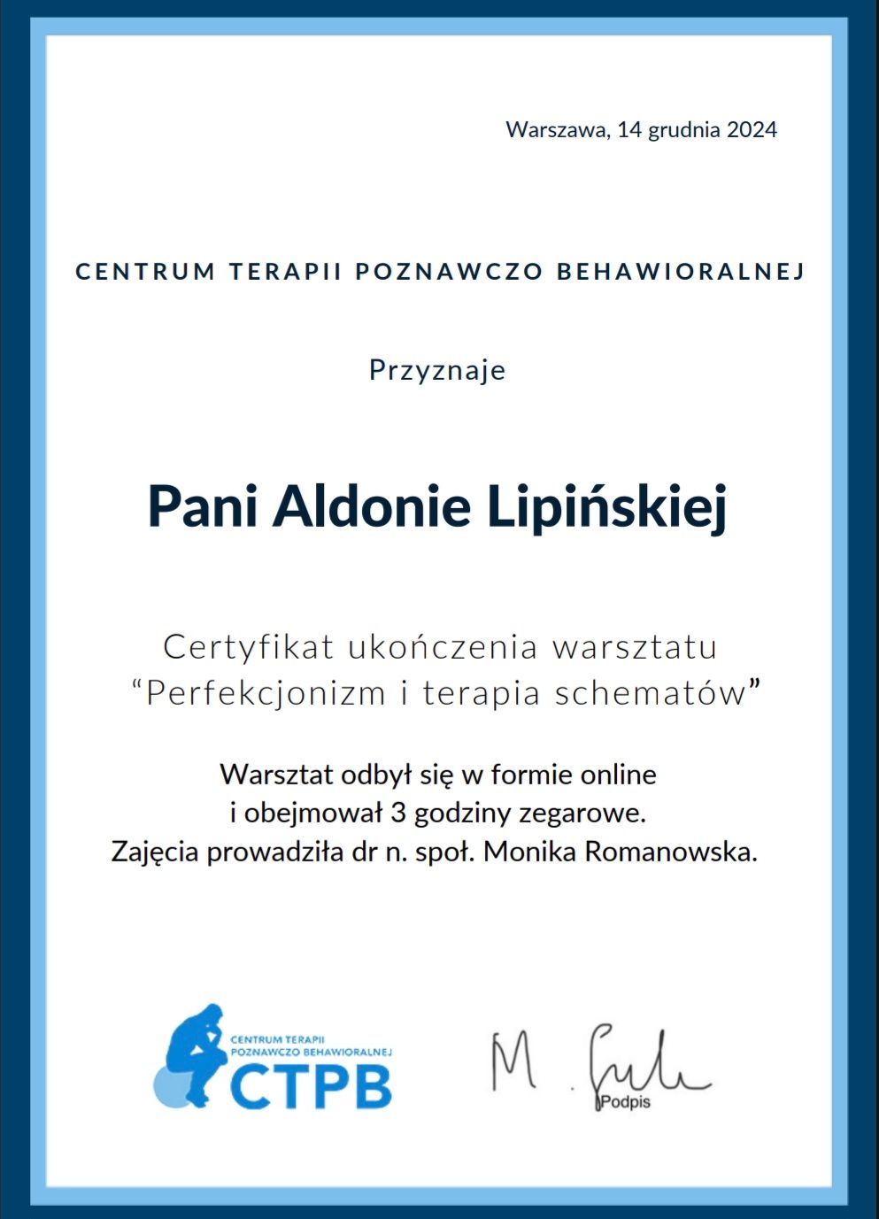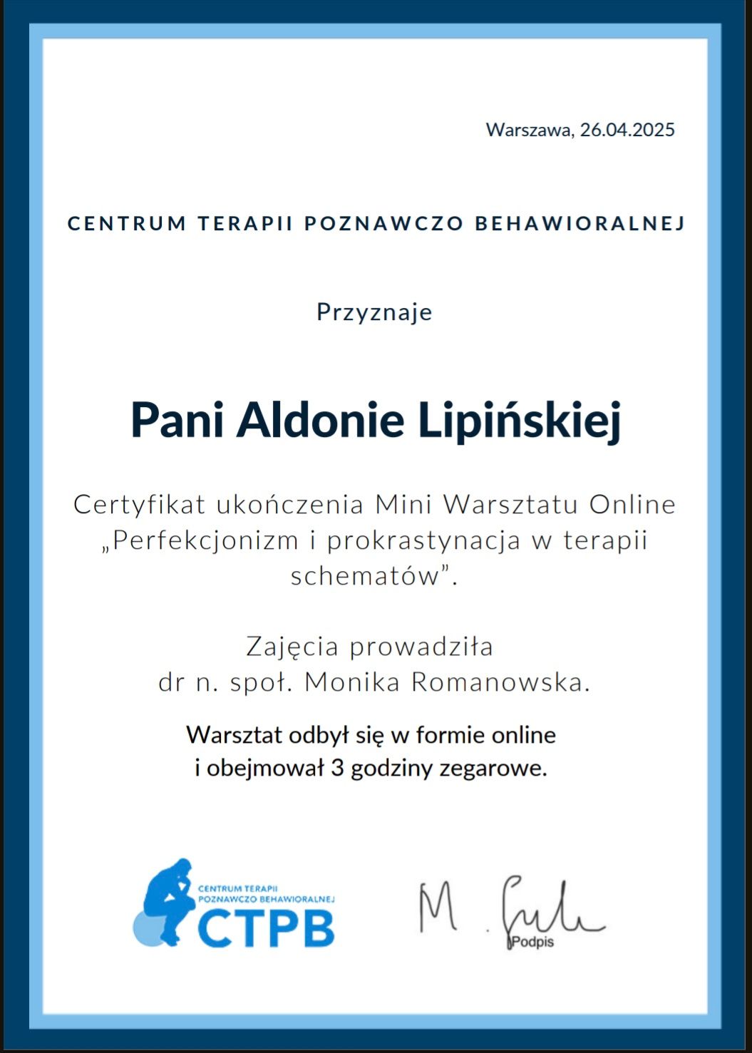 Stale rozwijam swój warsztat poprzez terapię własną i szkolenia m. in.: „Terapia Akceptacji i Zaangażowania w interwencji kryzysowej” „Dialog motywujący” "Podstawy diagnozy oraz psychoterapia u osób dorosłych z zaburzeniami neurorozwojowymi", "Perfekcjonizm i terapia schematu", "Jak budować relację terapeutyczną z perspektywy terapii schematu", "Prokrastynacja i perfekcjonizm w terapii schematu".