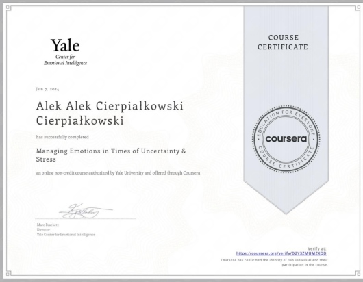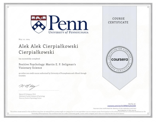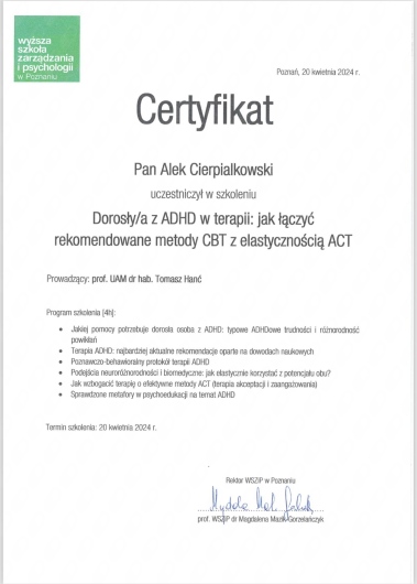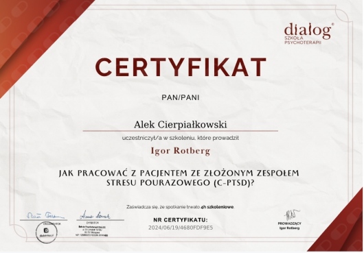 W bieżącym roku ukończyłem 14 specjalistycznych szkoleń, organizowanych przez takie instytucje jak University of Pennsylvania, University of Glasgow oraz University of Geneva. Moje zaangażowanie w rozwój zawodowy jest motywowane dążeniem do świadczenia najwyższej jakości usług terapeutycznych.