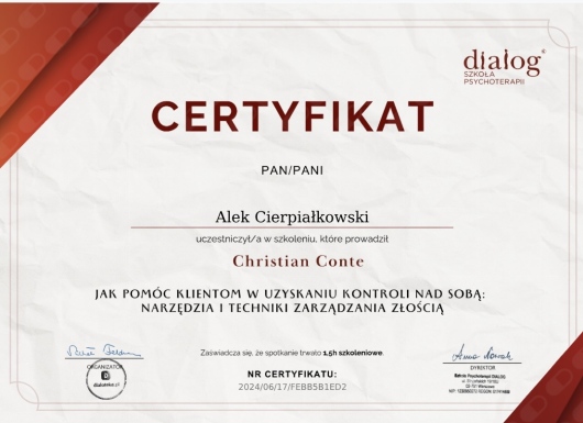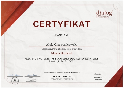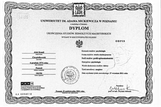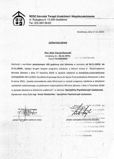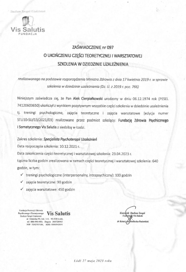 Ukończyłem akredytowaną przez KCPU szkołę psychoterapii uzależnień.